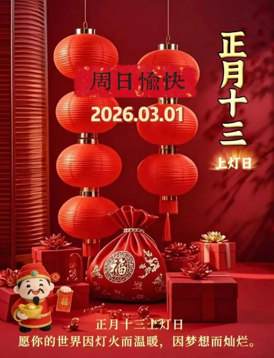 2026年3月1日,最新带日历问候图片祝福语:正月十三,吉祥如意到,花开富贵好,财运亨通进,事业步步高