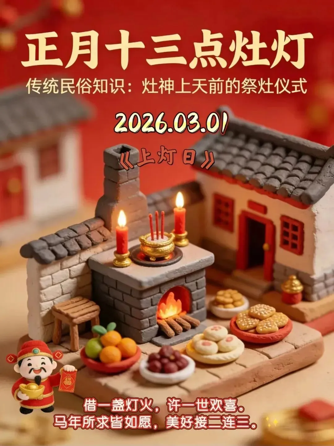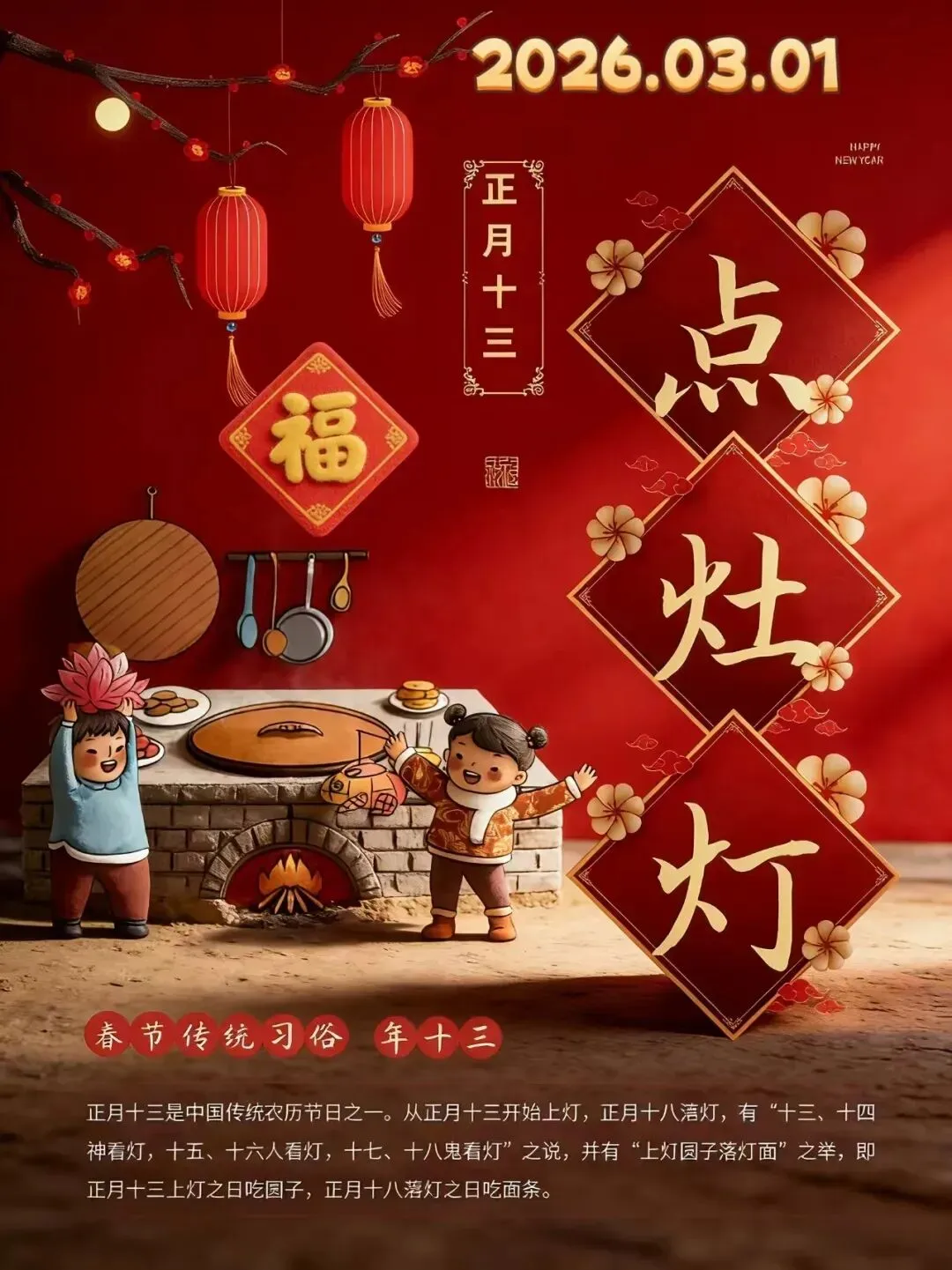 今天是正月十三,“点灶灯”送祝福:一来祝福人开怀,两手送上吉祥运,三羊开泰福祉多,四平八稳一整年,五福同享真如意,六六大顺人欢乐,齐天洪福也来贺,八方来财富贵多,九州同庆喜相逢,十全十美人红火!祝你马年大吉万事顺,好运连连万事成!!