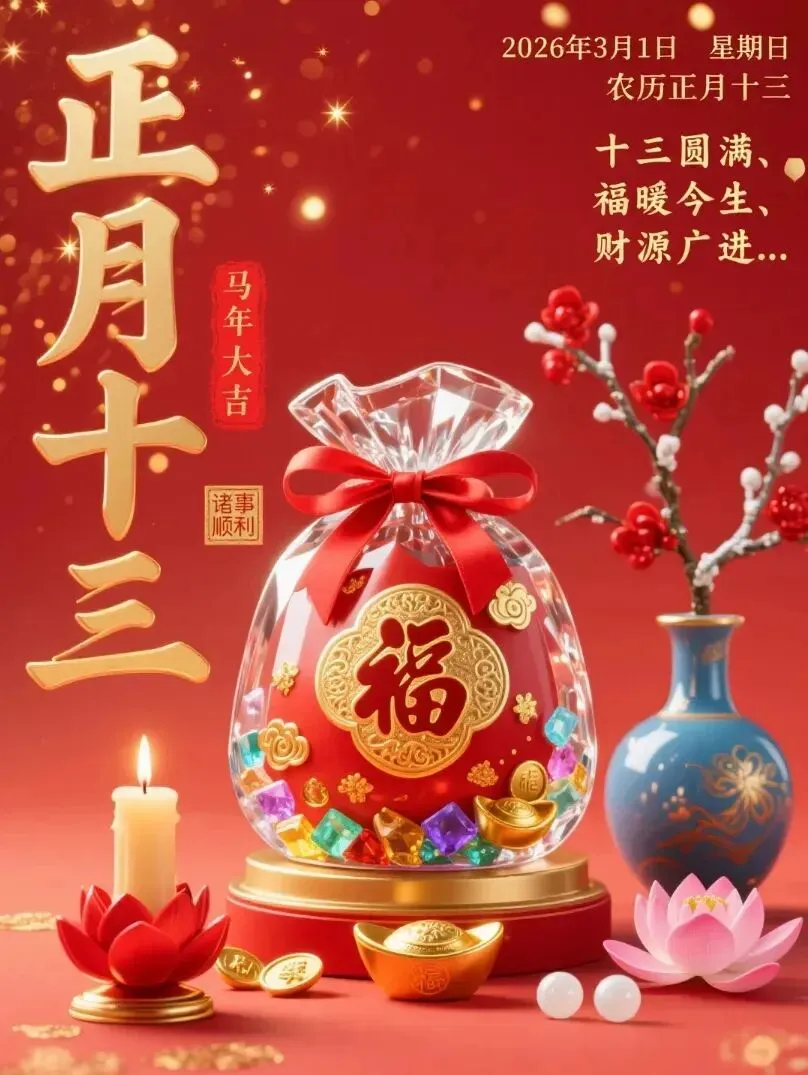 今天是正月十三,送你一份吉祥如意,愿你生活顺心顺意,送你一份幸福安康,愿你全家平安健康。送一份开门见喜,愿你一生笑口常开。送一份八方来财,愿你一世富贵吉祥。祝你幸福一辈子、快乐一辈子、好运一辈子!