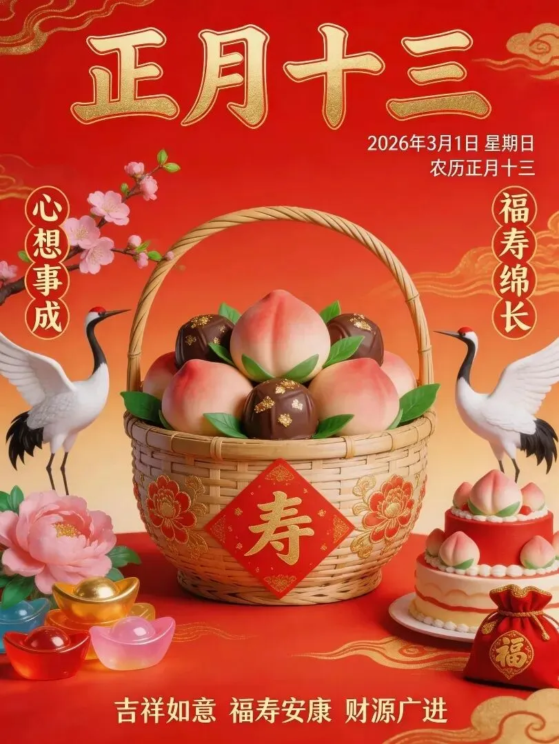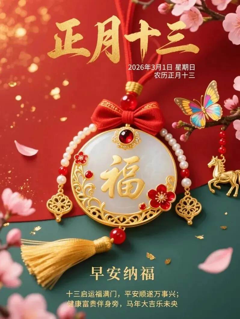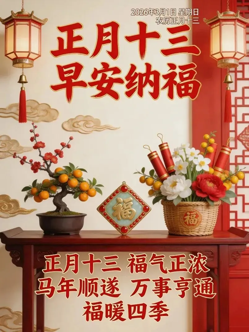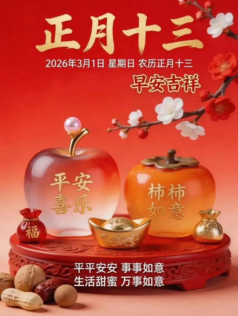 今天是2026年3月1日,农历正月十三,星期天,早安!春光明媚,万物复苏,处处洋溢着生机和喜悦,春色满园,风光无限。愿你在新年里,喜悦常在,好运如期而至,运势高涨,喜上眉梢,万事顺遂。大年十三,愿福运降临,福星高照,福泽深厚。愿你家人平安,事业顺利,千事吉祥,万事亨通,生活充满春光,幸福安康。