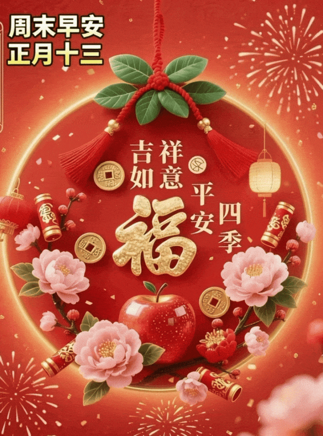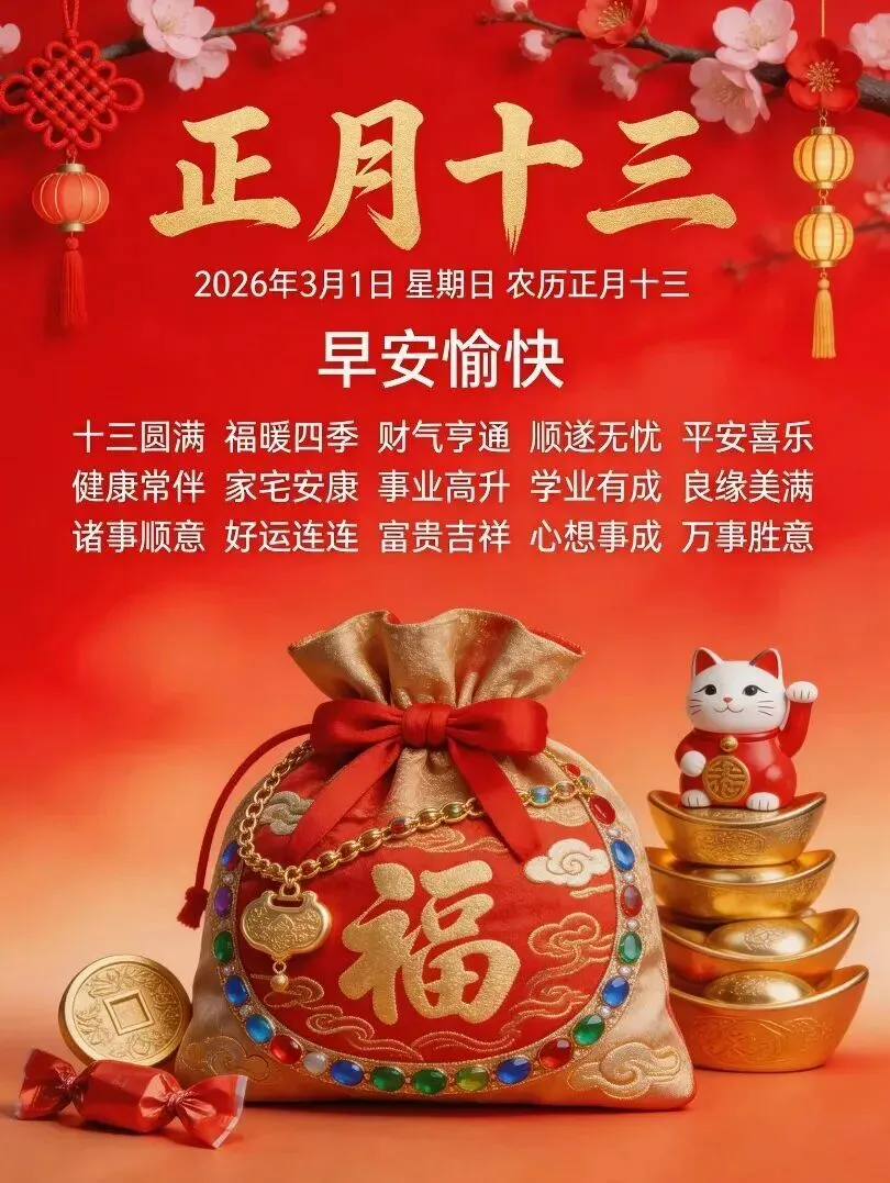 🌈大年十三,问候中,伴随平平安安,🌸祝福中,又迎来新的一天,🌞吃好喝好别心烦,放松情绪心放宽,💥风调雨顺心情好,忘掉烦忧身体健,🍄关爱自顺天高远,幸福吉祥保平安!💜
