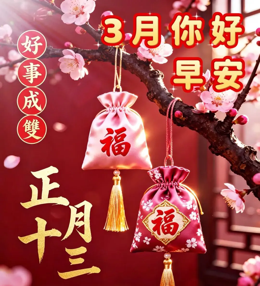 正月十三福气旺🧧,三月一日喜洋洋🥳,早安!愿三阳开泰迎祥瑞✨,三星高照护安康💪,三餐美满多幸福🥘。晨光铺路心舒畅☀️,万事无忧岁月长,一路繁花一路香🌸。