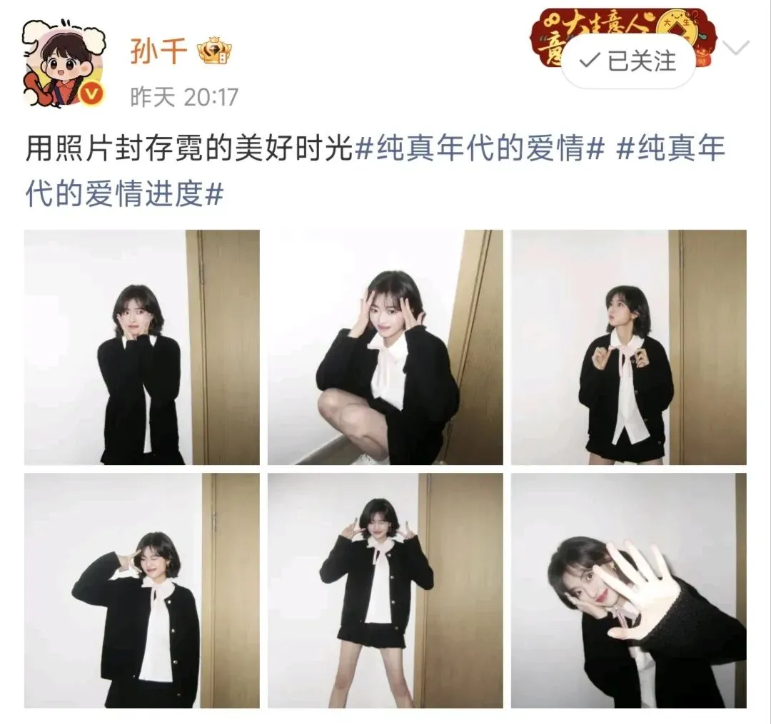 从捂嘴偷笑到双手托腮,从俏皮比耶到伸手挡镜头,孙千的六连拍表情丰富又自然,完美复刻了倪青的少女心事: