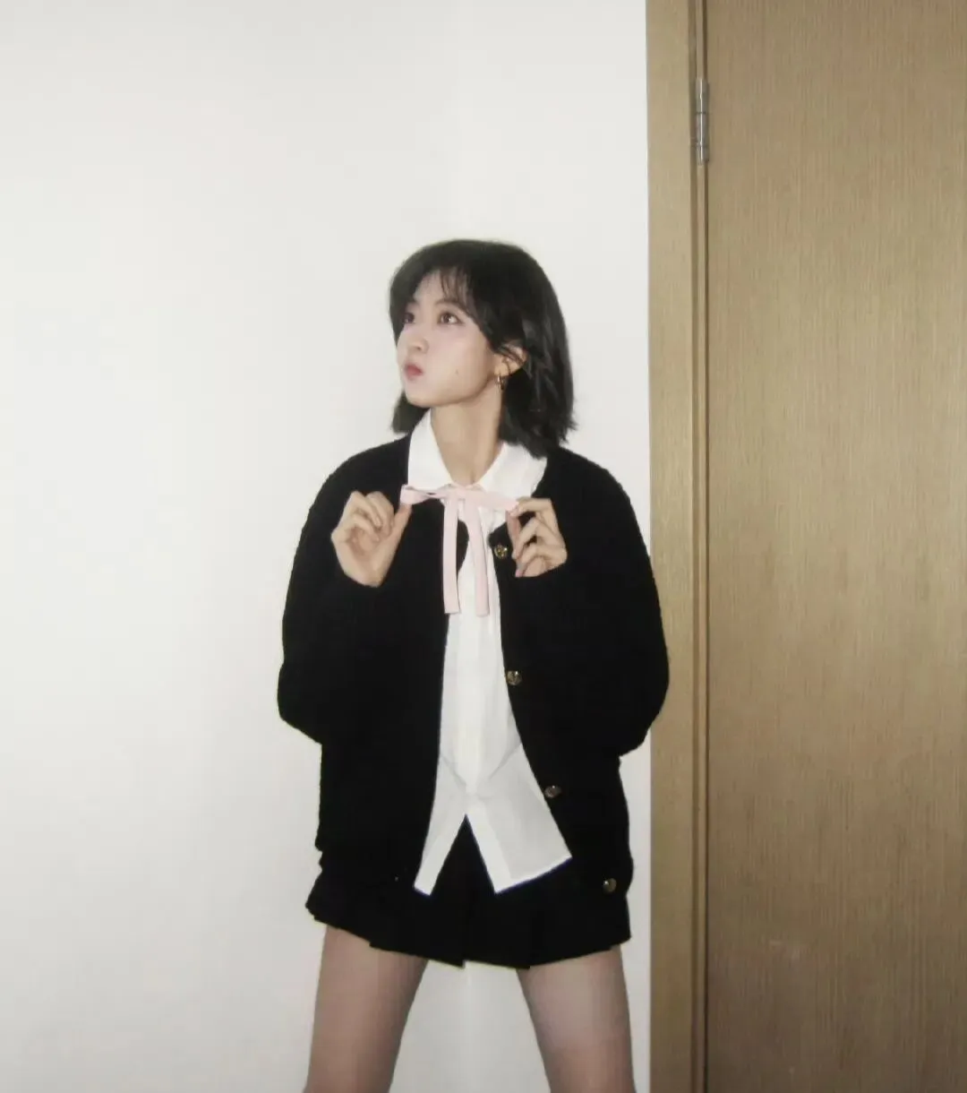而点睛之笔,是领口系着的粉色蝴蝶结,这点粉色瞬间中和了黑白色的沉静,增添了少女的娇俏与灵动。