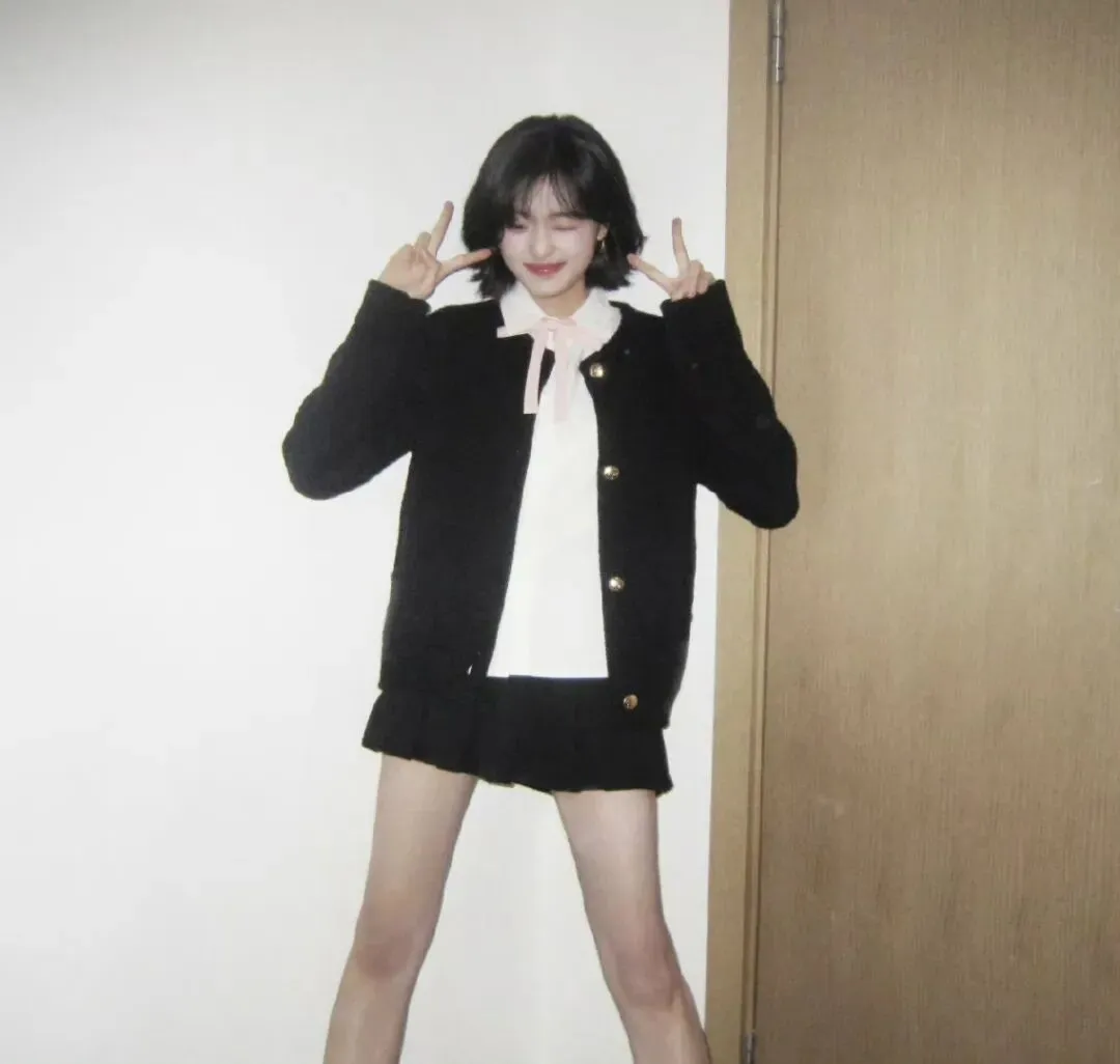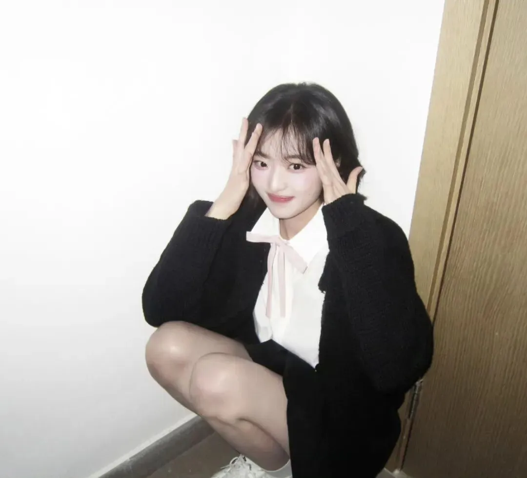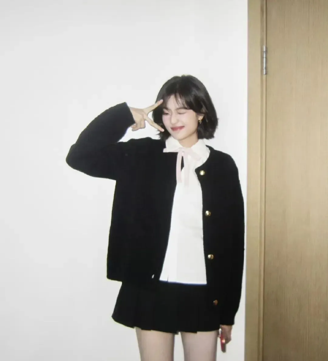 这组照片里,孙千的穿搭完全是剧中倪青的日常翻版——黑白经典配色:黑色针织开衫+白色衬衫+黑色百褶短裙,简直就是90年代校园里最具代表性的青春符号。