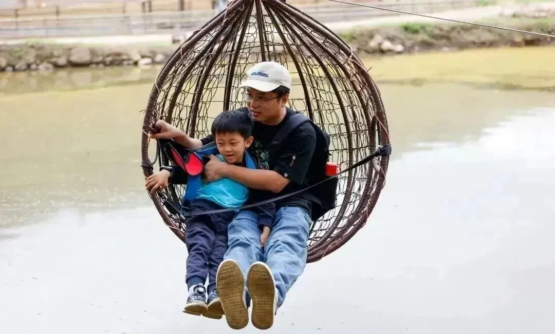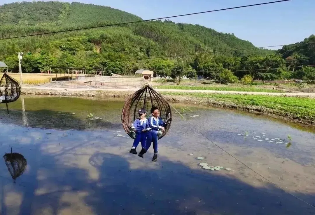这是一条跨越鱼塘的索道,做好安全措施,从绳子的一端飞向另一端,实现孩子童年最渴望的“飞行”梦!坐在“竹篮”里,从广阔的水面上飞掠而过,是怎样的刺激爽快!