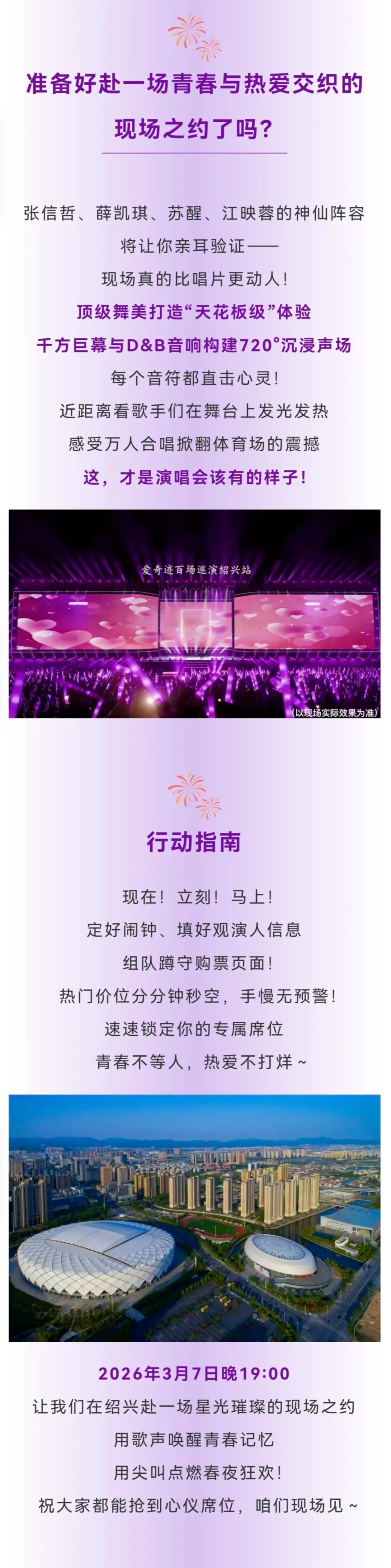后台人员进行优选后,会陆续进行联系,获奖粉丝可得到爱奇迹百场巡演·绍兴站演唱会门票一张(298元)。