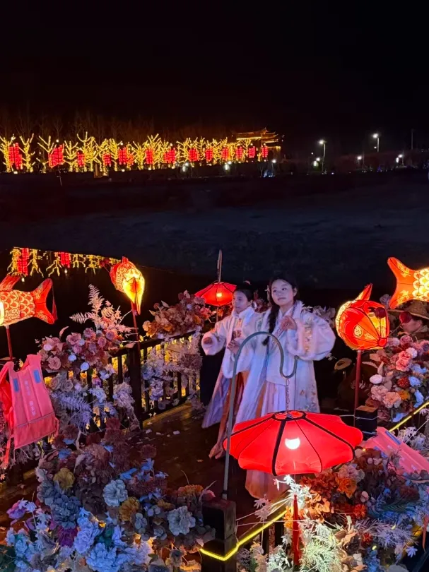 夜晚彩灯映碧波,花船缓缓行,