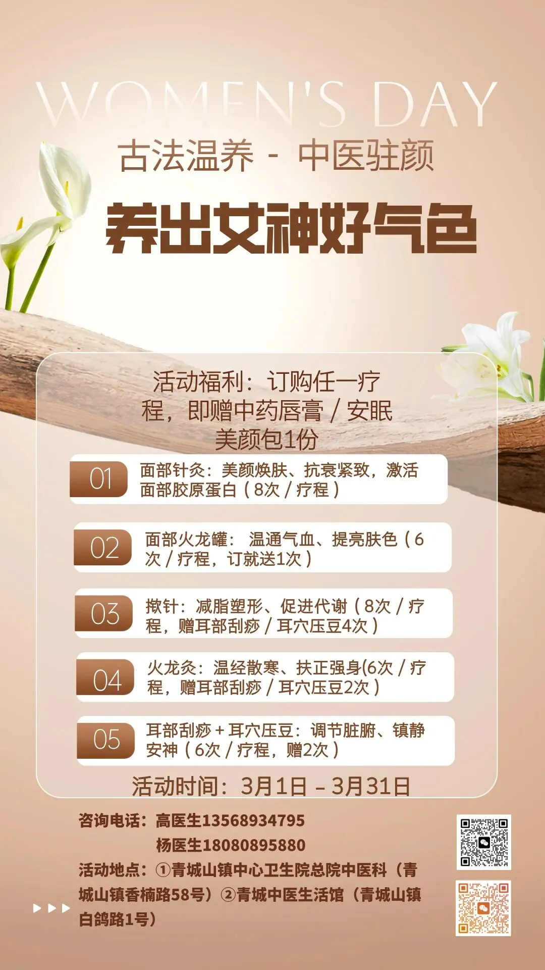 春季女性养生,重在疏肝理气、健脾祛湿、温补阳气。中医科精心推出女性特色养生体验,助您从“冬藏”平稳转入“春生”,由内而外焕发健康光彩。