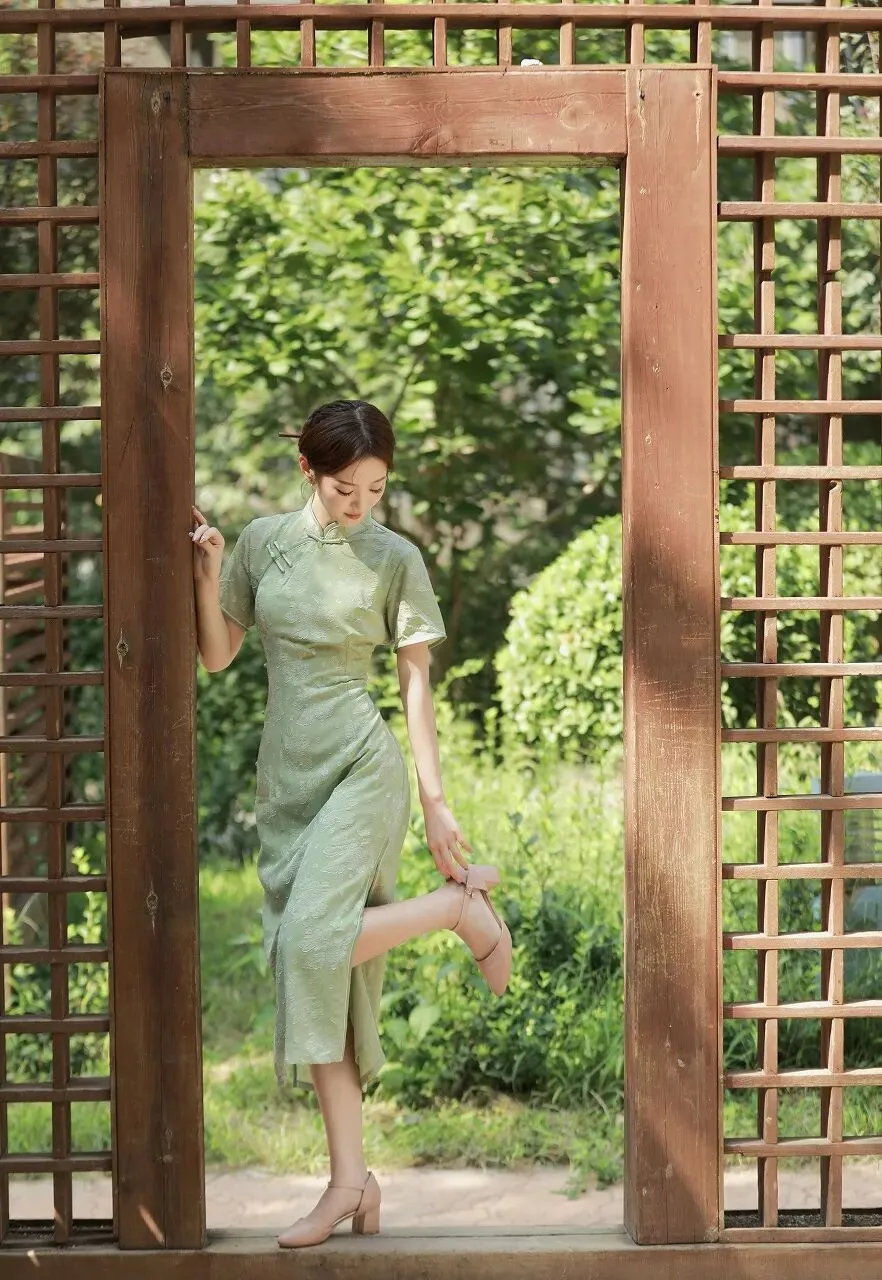 在当今这个快节奏的时代,我们常常被各种现代元素所包围,忽略了传统文化的魅力。然而,当我们看到这位身着旗袍、手持团扇的女子时,内心深处对传统文化的热爱被瞬间唤醒。我们开始怀念那些充满诗意的旧时光,怀念那些蕴含着东方韵味的传统服饰和配饰。其实,传统文化离我们并不遥远。它就在我们的生活中,在我们的衣食住行中。我们可以选择在某个闲暇的午后,穿上一件旗袍,手持一把团扇,漫步在古老的街巷中,感受那份来自旧时光的优雅与从容。我们也可以在学习和工作中,融入一些传统文化的元素,让传统文化在现代社会中焕发出新的活力。这位身着浅绿色旗袍的女子,就像是一扇通往东方美学世界的窗户。她让我们看到了传统文化的美丽与魅力,让我们感受到了东方韵味的独特与深邃。在这片绿影旗袍间,我们邂逅的不仅仅是一位佳人,更是一种文化,一种精神。
