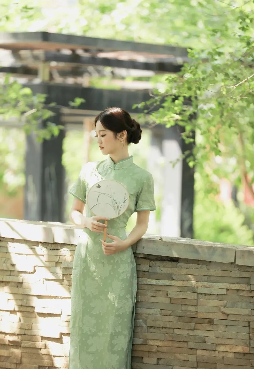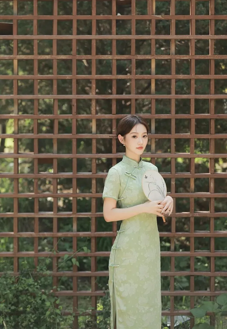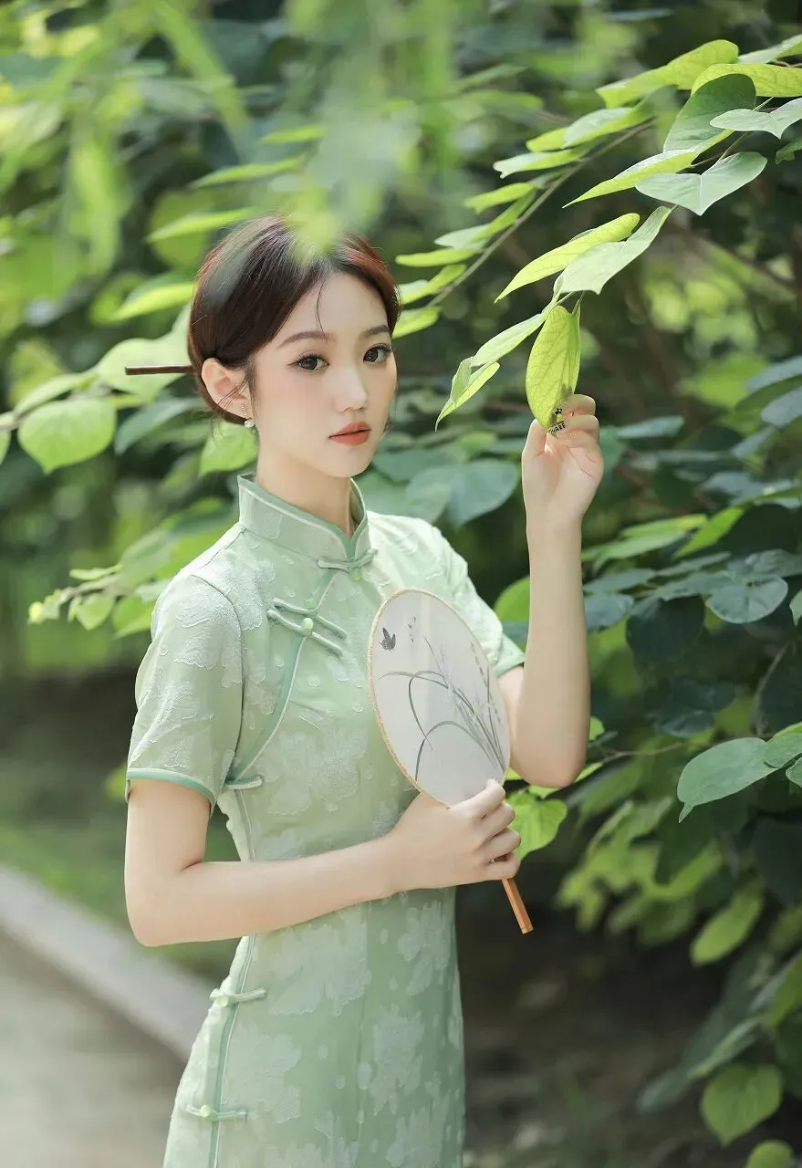 在时光的长河中,总有一些美好如同璀璨的星辰,闪耀着独特的光芒。当古典的旗袍邂逅葱郁的绿意,一场关于东方美学的浪漫之旅便悄然开启。画面中的女子,身着一袭浅绿色的旗袍,宛如从旧时光中走来的佳人,带着温婉与优雅,诉说着岁月的故事。那浅绿色的旗袍,像是春日里初绽的新芽,清新而柔和。旗袍上精致的白色花纹,如同细腻的工笔画,一笔一划勾勒出东方韵味的含蓄与典雅。立领的设计,端庄大方,衬托出女子修长的脖颈;盘扣精致小巧,宛如点缀在旗袍上的明珠,增添了几分灵动与俏皮。旗袍的剪裁贴合身形,将女子的曲线勾勒得恰到好处,尽显东方女性的柔美与婀娜。女子手持一把绘有花卉与蝴蝶的团扇,扇面上的图案栩栩如生,仿佛在微风中轻轻摇曳。团扇,这一古老的配饰,不仅是纳凉的工具,更是东方文化的象征。它曾出现在无数文人墨客的诗词画作中,承载着千年的风情与韵味。女子轻轻摇动团扇,扇面上的蝴蝶仿佛即将振翅飞舞,为整个画面增添了一份灵动之美。