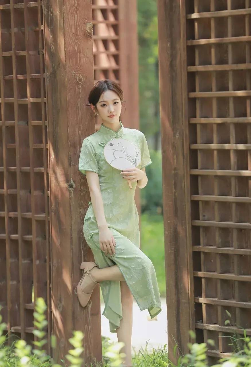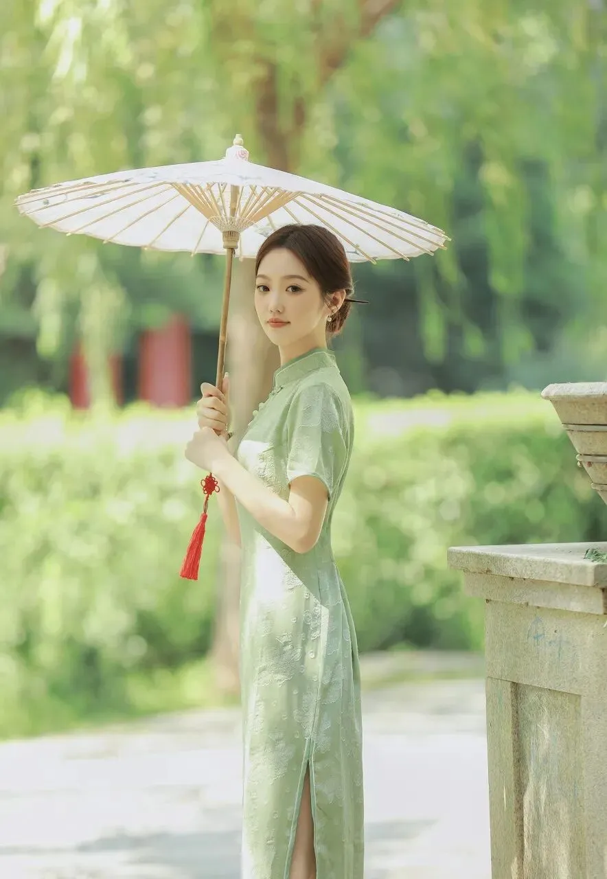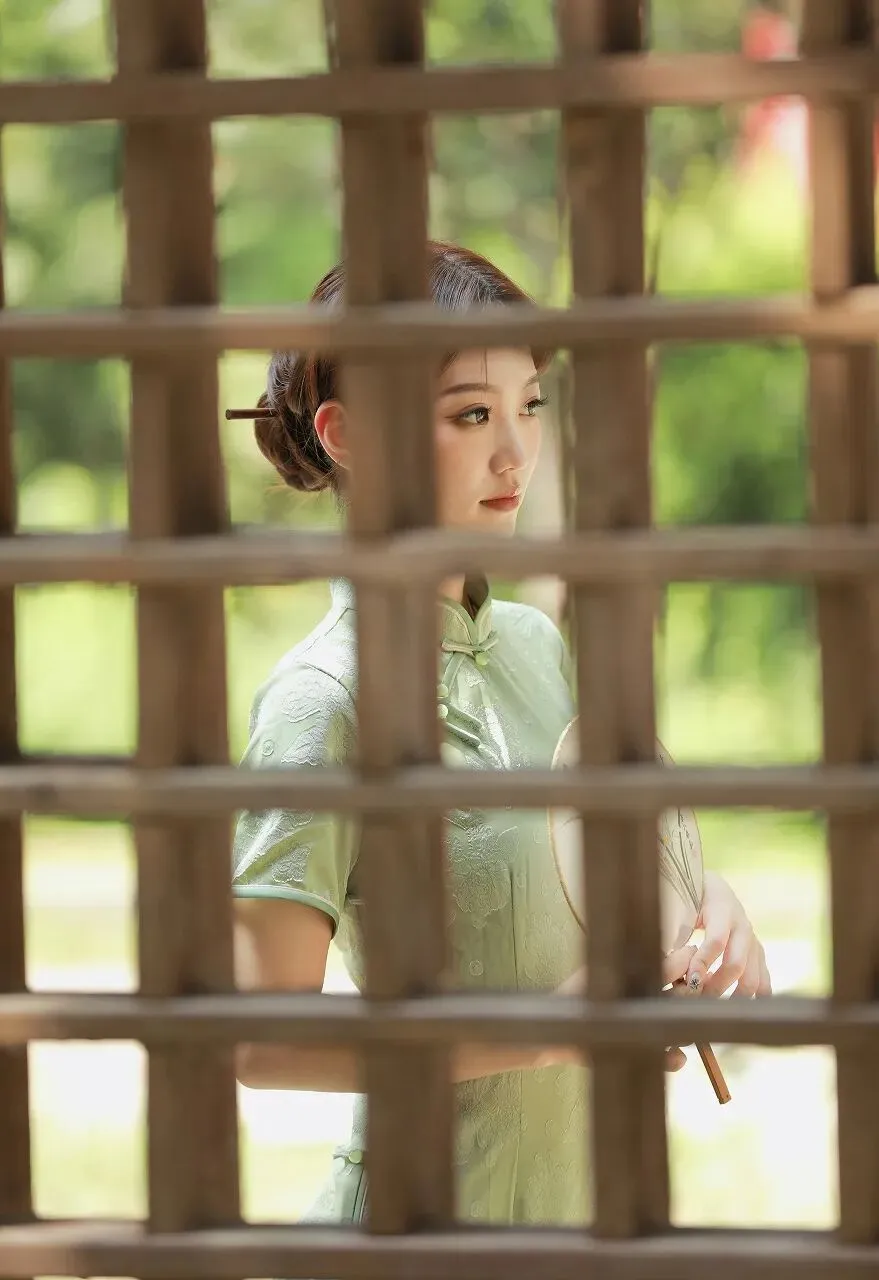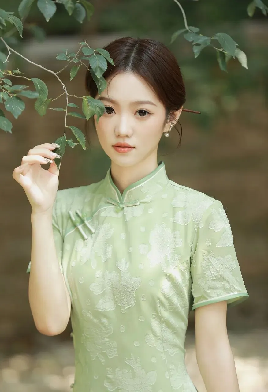 在时光的长河中,总有一些美好如同璀璨的星辰,闪耀着独特的光芒。当古典的旗袍邂逅葱郁的绿意,一场关于东方美学的浪漫之旅便悄然开启。画面中的女子,身着一袭浅绿色的旗袍,宛如从旧时光中走来的佳人,带着温婉与优雅,诉说着岁月的故事。那浅绿色的旗袍,像是春日里初绽的新芽,清新而柔和。旗袍上精致的白色花纹,如同细腻的工笔画,一笔一划勾勒出东方韵味的含蓄与典雅。立领的设计,端庄大方,衬托出女子修长的脖颈;盘扣精致小巧,宛如点缀在旗袍上的明珠,增添了几分灵动与俏皮。旗袍的剪裁贴合身形,将女子的曲线勾勒得恰到好处,尽显东方女性的柔美与婀娜。女子手持一把绘有花卉与蝴蝶的团扇,扇面上的图案栩栩如生,仿佛在微风中轻轻摇曳。团扇,这一古老的配饰,不仅是纳凉的工具,更是东方文化的象征。它曾出现在无数文人墨客的诗词画作中,承载着千年的风情与韵味。女子轻轻摇动团扇,扇面上的蝴蝶仿佛即将振翅飞舞,为整个画面增添了一份灵动之美。