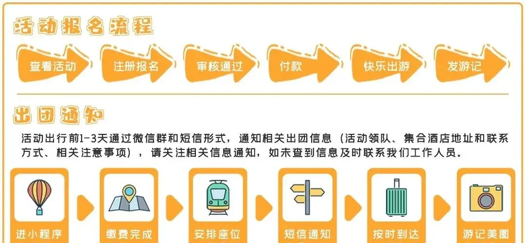 2.本活动35人成团,由于活动需要前期预定车辆,参与人员报名时收费。如有特殊原因取消报名,一日游(汽车团)请出团前1天通知,其他请出团(汽车团)前3日通知(如果因自身原因又未按规定通知的,费用不退,请慎重安排);