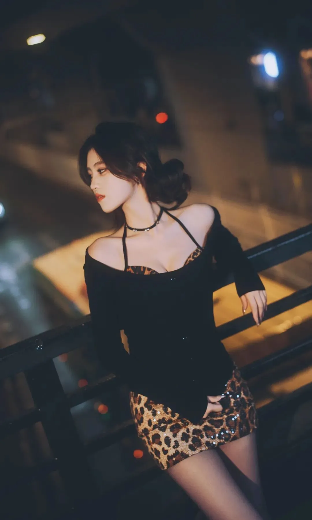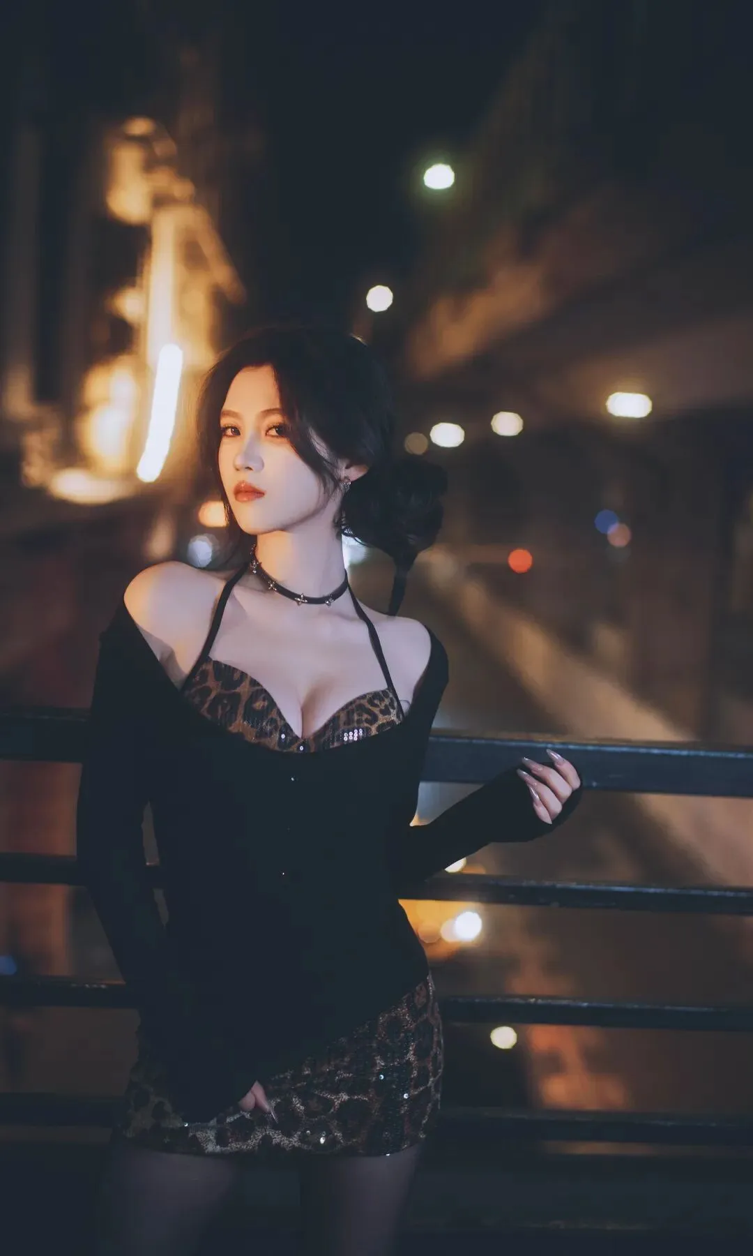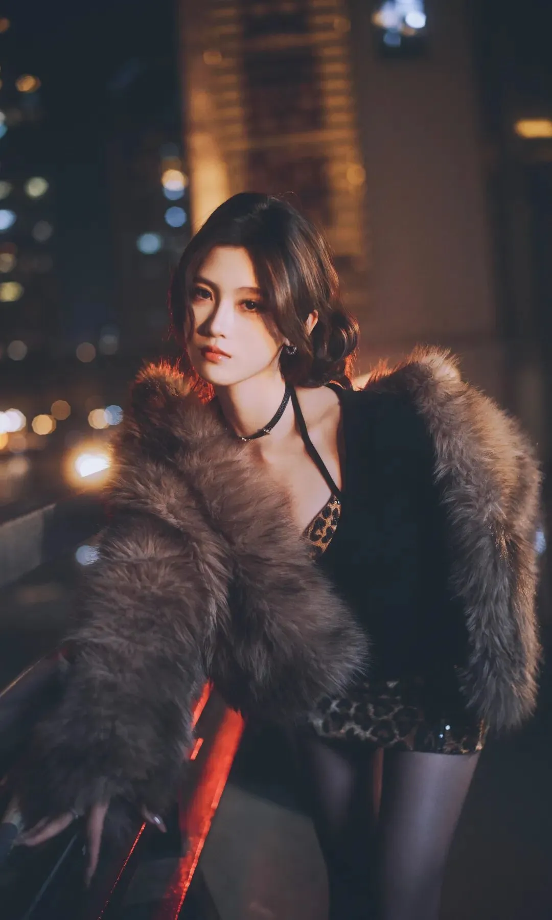 📷夜色霓虹下,野性豹纹与奢华皮草碰撞出致命吸引力。吊带勾勒曲线,毛绒外套包裹暖意,颈间细链点缀冷艳气质。黑丝与豹纹短裙的组合,在城市光影里,将复古与性感演绎得恰到好处,每一步都踩在心动的节拍上。