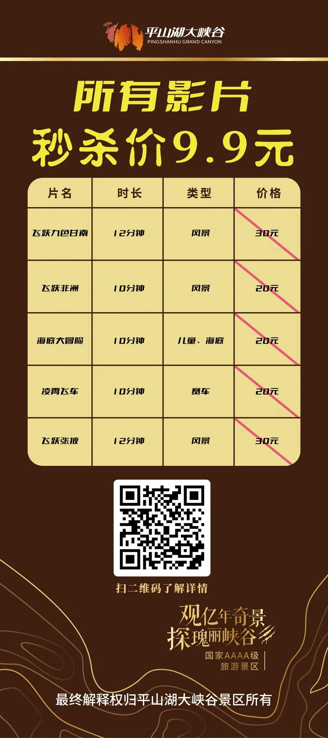 沉浸式体验峡谷震撼,视觉盛宴免费享!3月8日当天,球幕影院所有影片女性免费观看同行其他游客还可享9.9元秒杀观影福利超震撼的视听效果,沉浸式感受平山湖大峡谷的壮美风光这场视觉盛宴,邀你免费赴约~