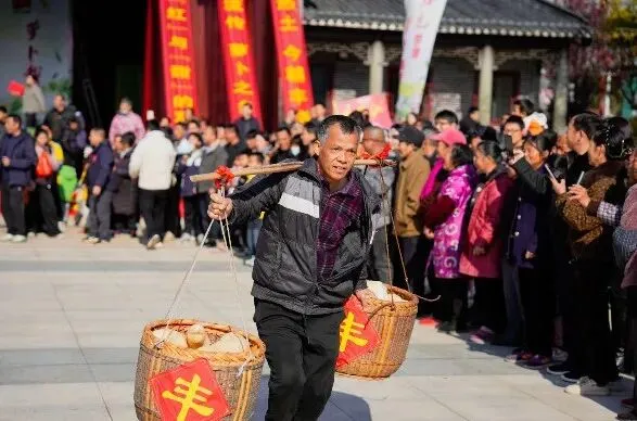 ▶ “担萝卜”接力赛——挑箩筐蛇形奔跑,还原送粮上井冈;