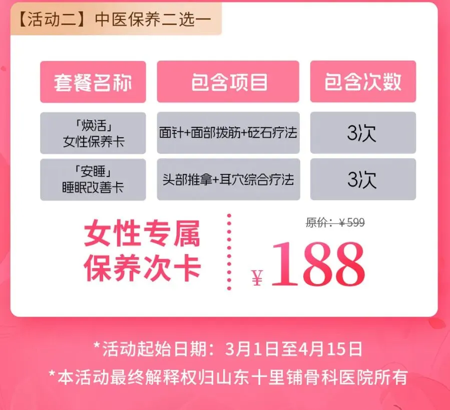 山东十里铺骨科医院始终将女性健康放在重要位置,值此三八女神节之际,我们精心策划了“女神节专属健康礼遇”活动,用专业和温暖,为每一位女性送上实实在在的健康关怀。