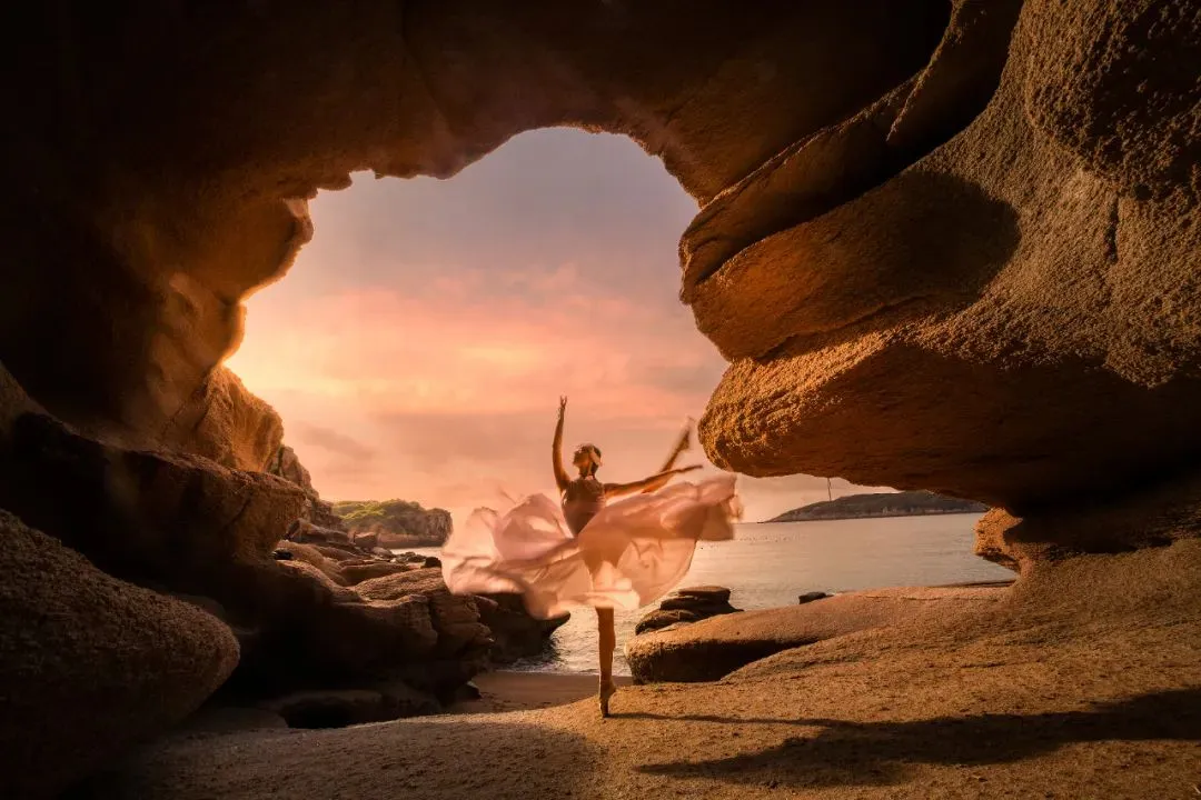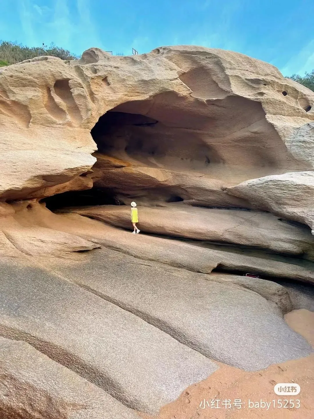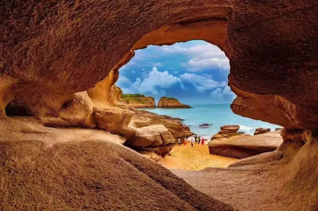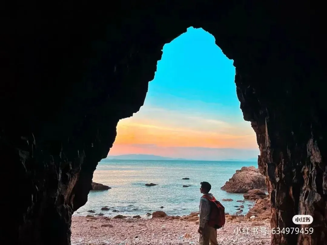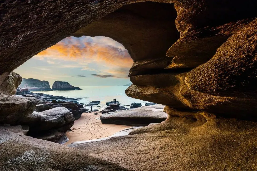 海蚀洞环绕着海岸线,犹如一个奇形怪状的天然相框,站在洞穴内向外望去,将海岸礁石风光、清澈湛蓝的海水、千姿百态的礁石与晶莹剔透的沙滩融合成的美,定格在你的眼中。这是大自然给予我们的浪漫。退潮时带来的震撼,是海浪击中内心后的久久无法平息。