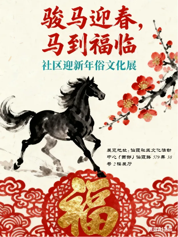 以“马”为象征,融合新春佳节与传统年俗文化,展现“马到成功、福临万家”的喜庆氛围,传递奋进、吉祥的新年祝福。通过本次展览,弘扬中华优秀传统文化,增强民族认同与文化自信,为观众营造一个充满年味、喜庆祥和的新春文化空间。