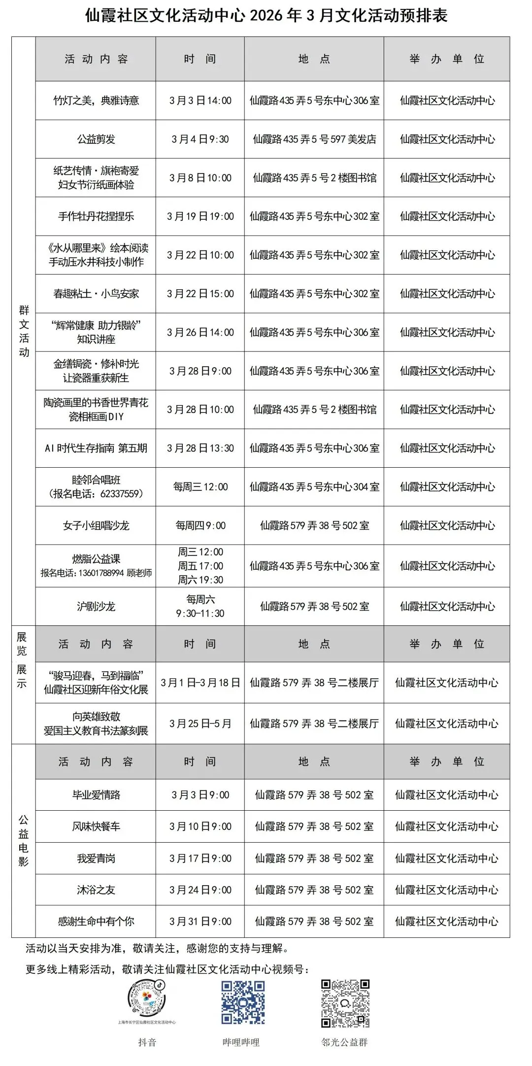 仙霞社区文化活动中心相关活动均为免费报名参加,如接到电话邀请或推荐,请拨打中心座机核实。