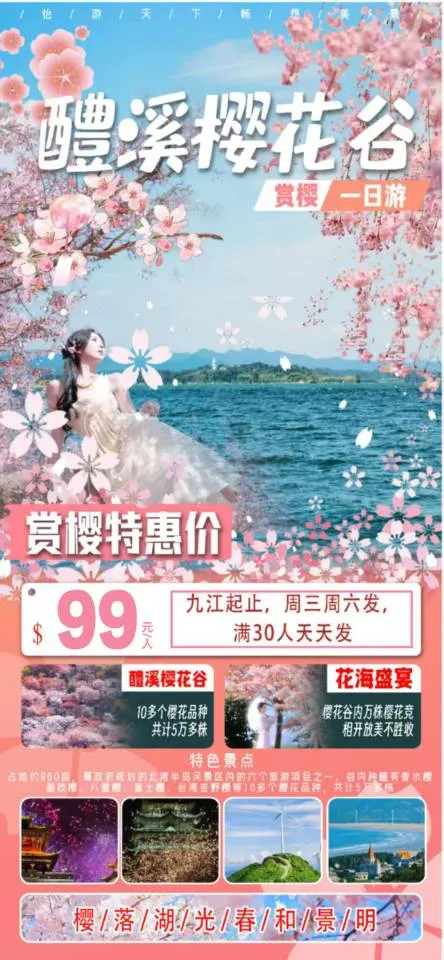 当天早晨九江新桥头环境国旅或甘棠公园门口集合(具体时间以通知为准),由领队带领乘旅游空调车,前往网红打卡地游览【醴溪樱花谷】(含门票)座落于八百里修河中段江畔,占地约960亩,属政府规划的北湾半岛风景区内的六个旅游项目之一。谷内种植有香水樱、垂枝樱、八重樱、富士樱、台湾吉野樱等10多个樱花品种,共计5万多株。樱花谷内万株樱花竞相开放,美不胜收,吸引众多游人前来踏青赏花,休闲畅游。