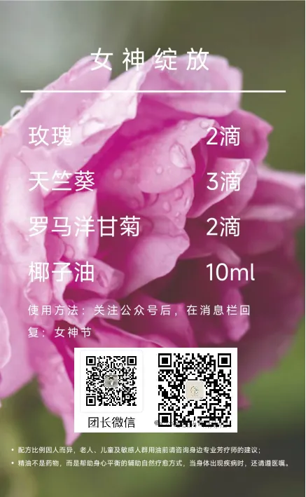 真正的女神节礼物,不在于价格的高低,而在于是否真正看见了自己的需求。这份由玫瑰、天竺葵和罗马洋甘菊共同谱写的芳香方案,愿成为你送给自己的一份温柔承诺——无论身处何种角色,你始终值得被珍视、被呵护、被爱。在这个属于你的节日里,让植物的芬芳,陪你从内而外,优雅绽放。
