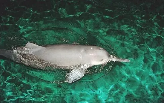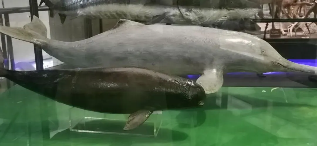 白鱀豚是我国特有的鲸目淡水豚科动物,迄今已有2500万年的历史,和大熊猫、金丝猴、朱鹮等珍稀动物一样,都是我们的国宝。白鱀豚身体呈纺锤形,成体体长可达2.5米,体重可达230公斤,吻部窄而长,眼极小,纵长形呼吸孔位于头顶,背鳍稍低呈三角形,前鳍宽而钝圆,尾鳍平展中有凹陷,身体表皮光滑细腻,背面呈浅蓝灰色,腹面白色,整体形态与海豚相似,但也有明显差异。白鱀豚脑容量较大,智力水平堪比灵长类动物,拥有一套独特的声呐信号系统在水中定位识别物体,性情温和,喜群居,食谱以小型淡水鱼类为主,处于长江生态链的最顶端。白鱀豚主要栖息于长江中下游及与其连通的洞庭湖、鄱阳湖、钱塘江等水域中,在长江里生活了千百万年,被称为水中“活化石”,极为珍罕,是国家一级重点保护野生动物。令人痛心的是,20078月,白鱀豚被宣布功能性灭绝,迄今20多年没有确证的发现记录了。