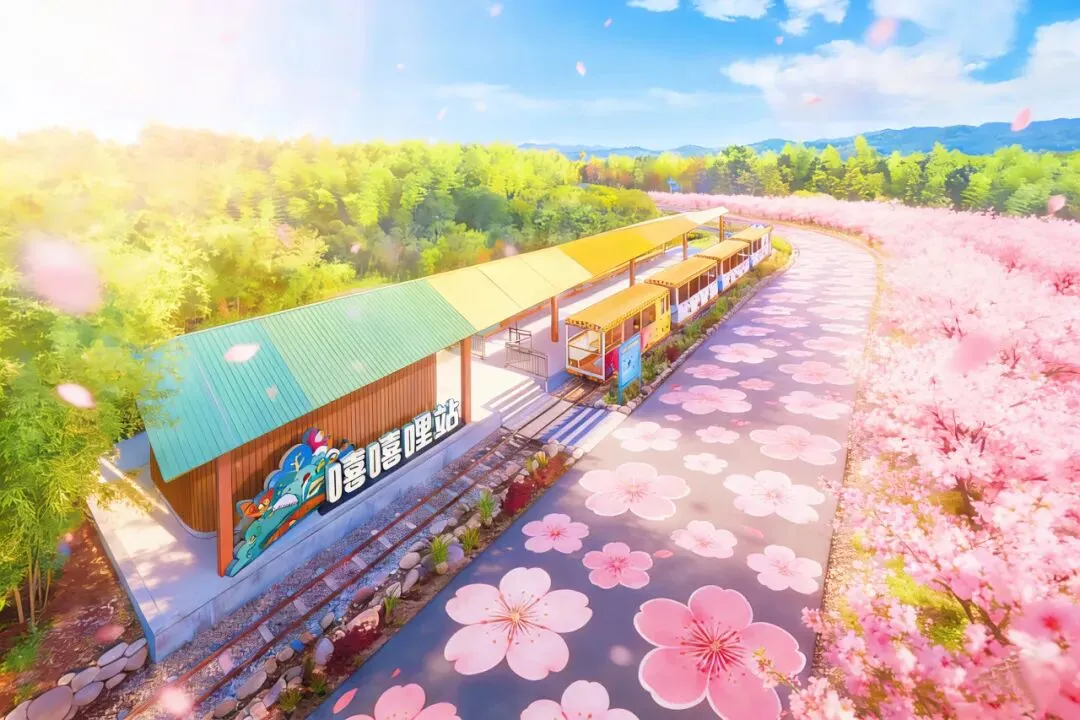 小火车始发站沿路全新布置,桃花地贴,沿路桃花,漫步花路,步步生花,沉浸式邂逅春日浪漫。