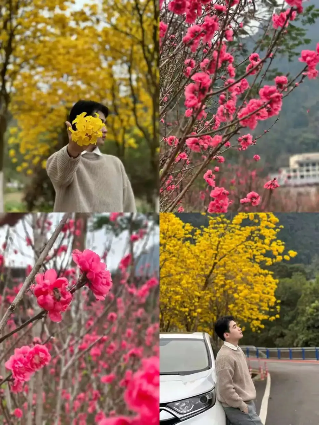 漫山桃花林灼灼绽放,金黄黄风铃花摇曳生姿,还有浪漫四季花海次第盛开。