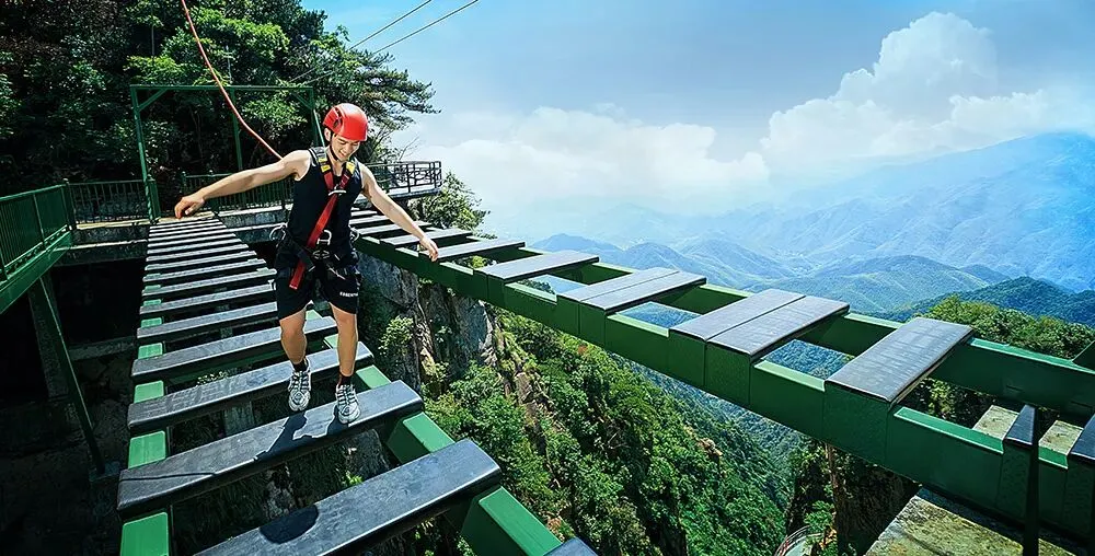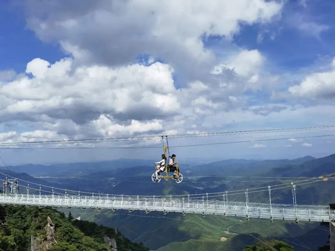 你在自行车上看风景,看风景的人也正在桥上看你~设置在水晶廊桥上方的空中自行车,刺激大幅升级,你与悬崖的距离就只剩一条钢索,最大程度挑战你的胆量!