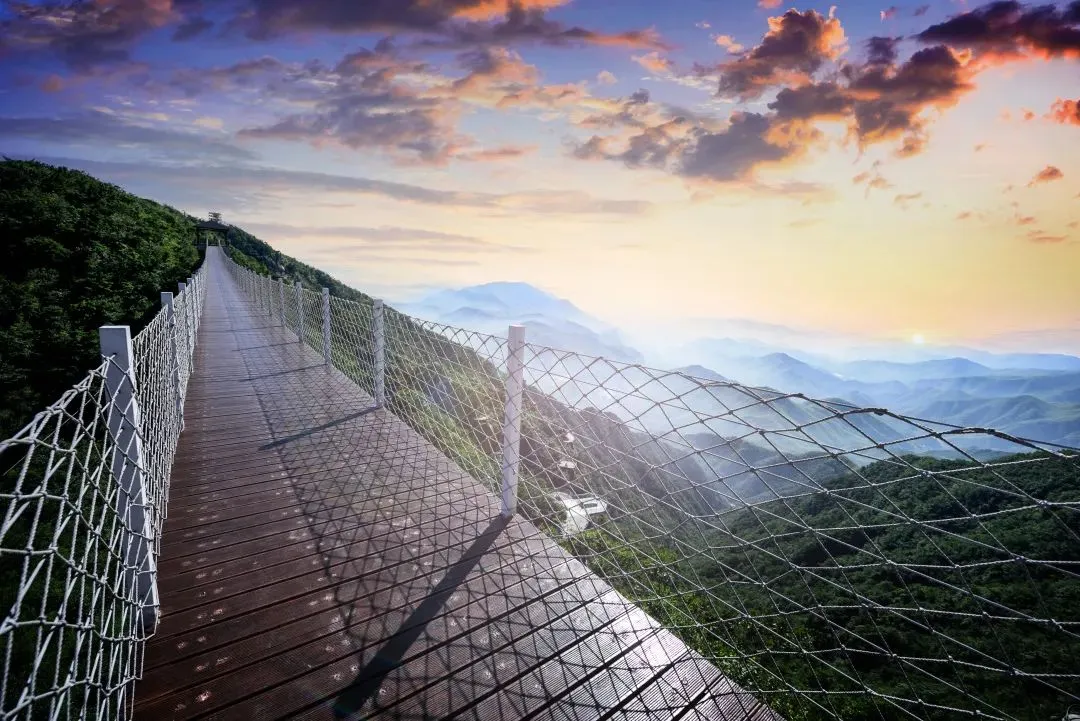 全长131.4米,晃晃悠悠徜徉云海山下雾气凝聚升至山顶,栈桥上犹如腾云驾雾、置身仙境。