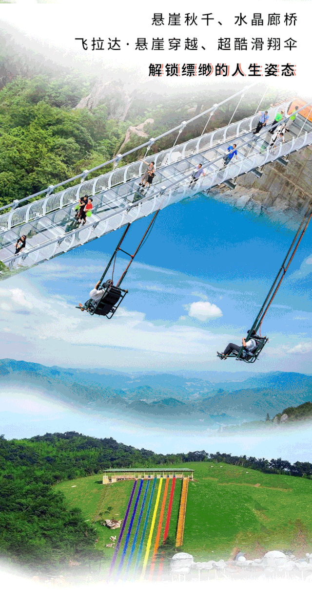 开放的悬崖乐园足以震撼华东,悬崖秋千 、水晶廊桥、天空之阶,云中漫道等……让你玩到脸红心跳,大呼过瘾!