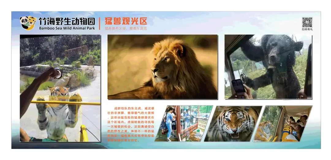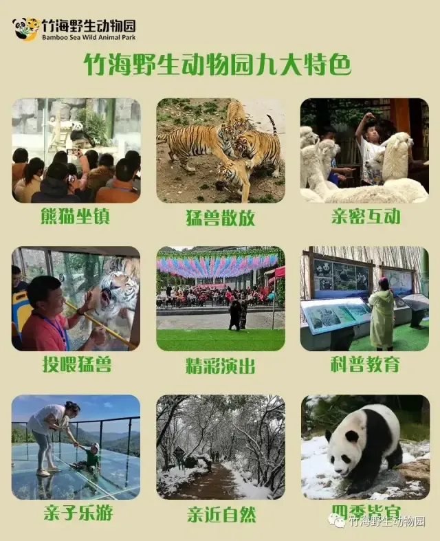 园区主要分猛兽散放区、小动物乐园、万亩竹海休闲区,现有东北虎、狮子、黑熊、小熊猫、猕猴、羊驼、梅花鹿、黇鹿、孔雀、鸵鸟、荷兰猪、鸸鹋等30余种近3000只动物,还将继续引进大熊猫、火烈鸟、大象、长颈鹿等,是中原地区以散放猛兽和与动物互动为主要特色的野生动物园,也是周末游、亲子游、科普教育游、避暑休闲游目的地。