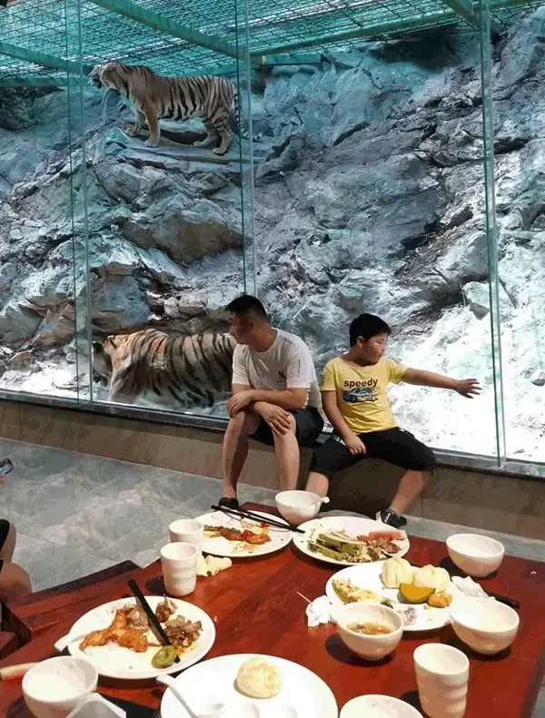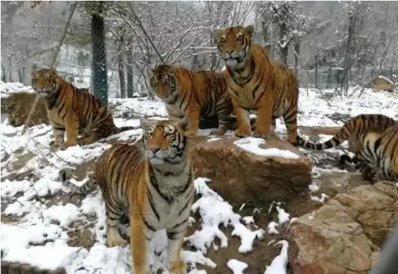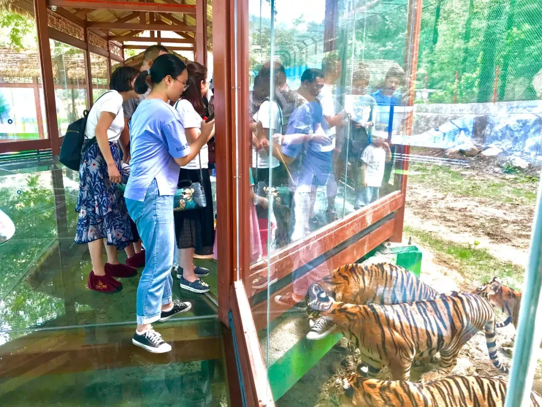 景区有122只东北虎,是国内同时汇聚,南北两大血统的东北虎散养和繁育基地,身边一群散放东北虎,聚在一起,可以透过玻璃投食孔给老虎喂食。