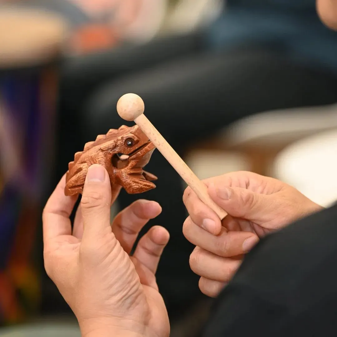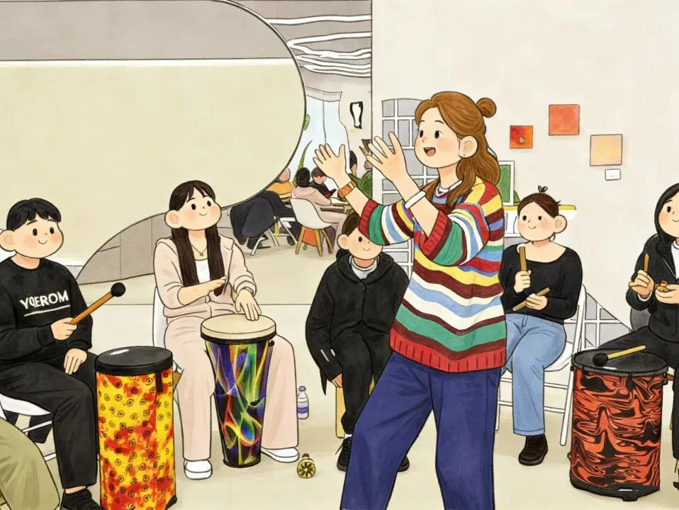 一群人围坐成一个圆。没有舞台,没有观众,没有表演者。每个人面前都放着一件打击乐器:鼓、沙锤、铃鼓、木鱼……你不需要认识它们,不需要学过乐理,甚至不需要有任何“音乐细胞”。