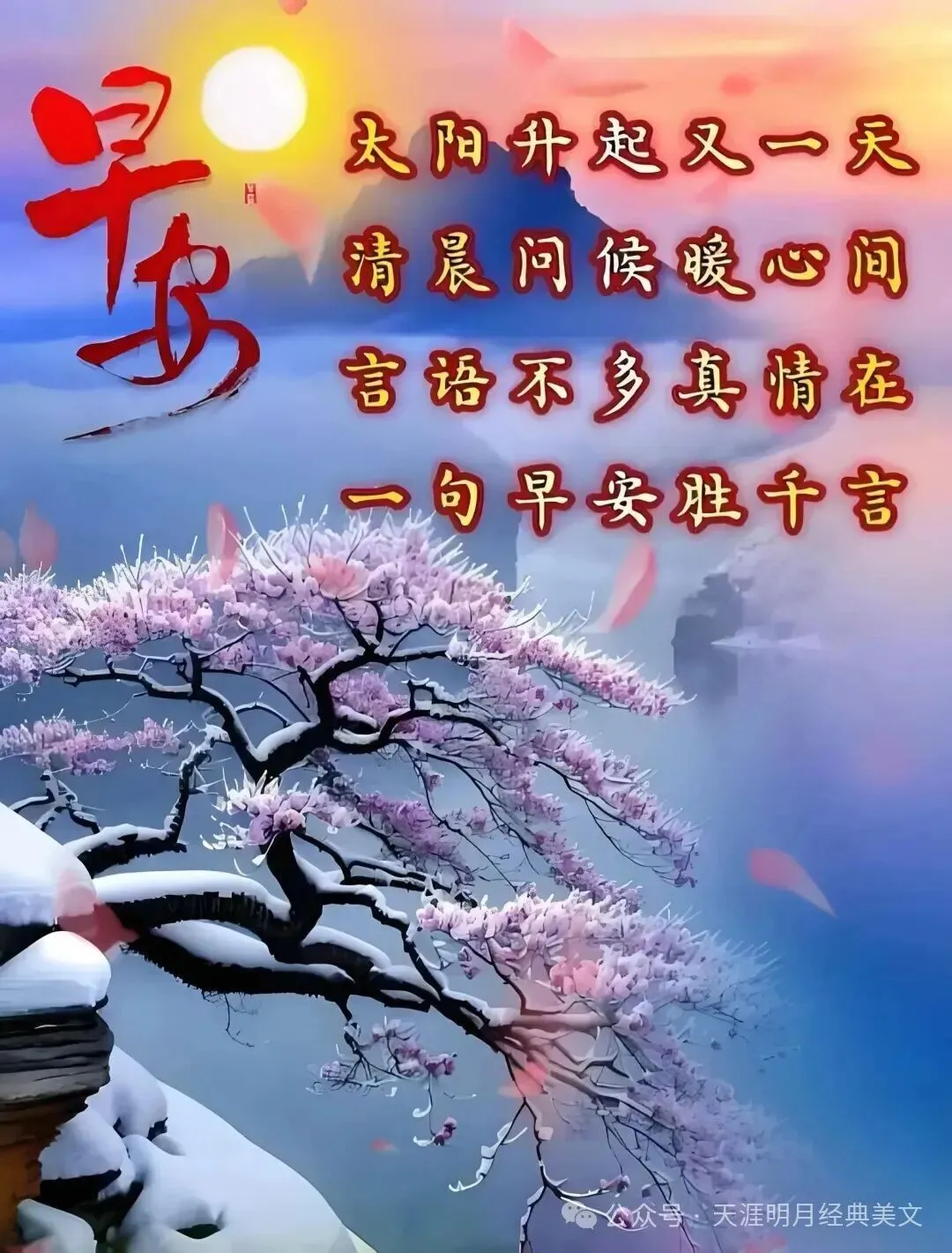 13、🌞早上好,月缓缓前行,情意深深留存,腊月寒意浓,情谊暖心中。深深情谊已珍藏,🌺用微笑点缀梦想,祝福悄悄来送上,🍀提醒一句记得添衣裳,腊月保暖,福寿绵长。雪花飞,雪花舞,🌞愿你永远快乐!朋友们早安!🌞