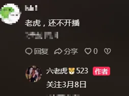 还有粉丝问:老虎,还不开播?老虎回复:关注3月8号。看来老虎也准备在抖Y直播了。