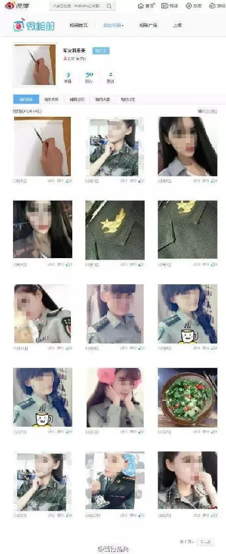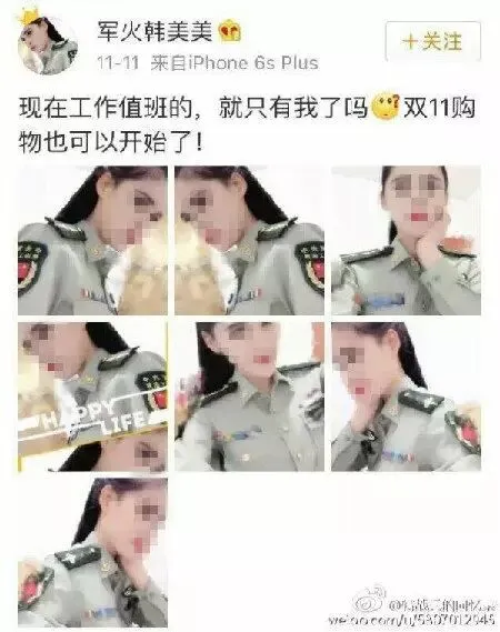 这个“军火韩美美”标榜自己是名女军官,在微博上晒了大量穿着军装的照片。这些军装照有时佩戴着中尉军衔、有时佩戴着上尉军衔,资历章漏洞百出,且浓妆艳抹、军容不整、举止不雅;她戴着“军委政治工作部”的臂章和“韩玲”的姓名牌,处处显摆自己是军队高级机关的干部,言行中不时“透露”自己的“巨大背景”;在本应着冬常服的11月11日,她晒出的网络购物“自拍照”却还身着夏常服;面对质疑和揭露她是假军人的正义网友,她极力狡辩,给对方留的自己的电话号码却是军委纪委的征兵举报电话……