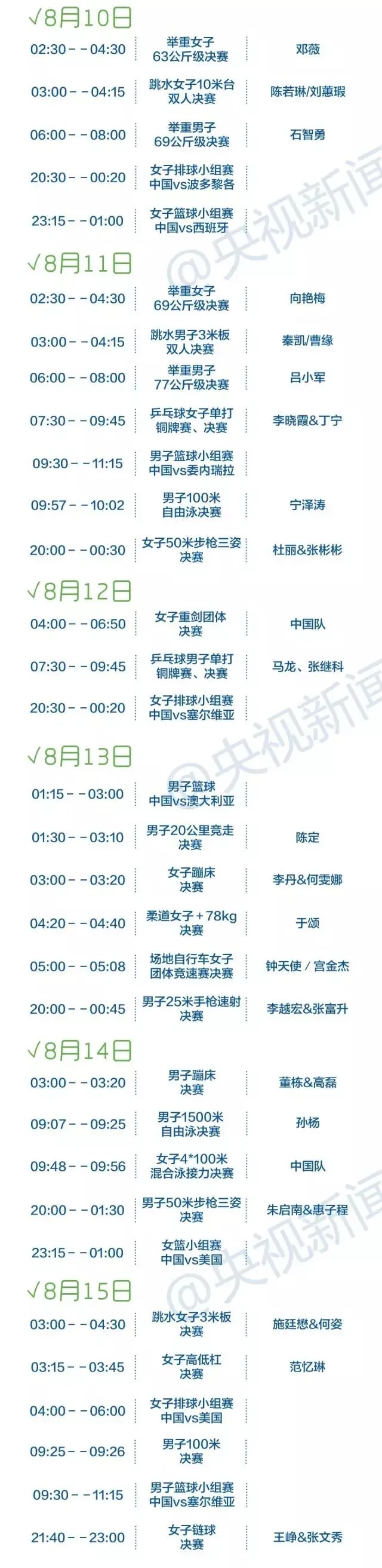 北京和里约之间11个小时的时差,让中国粉丝不得不开启“夜猫子模式”。收下这份中国版里约奥运观赛指南,夺金时刻全知晓。为中国队加油吧!北京时间=里约时间+11小时。以下时间均指北京时间哟!