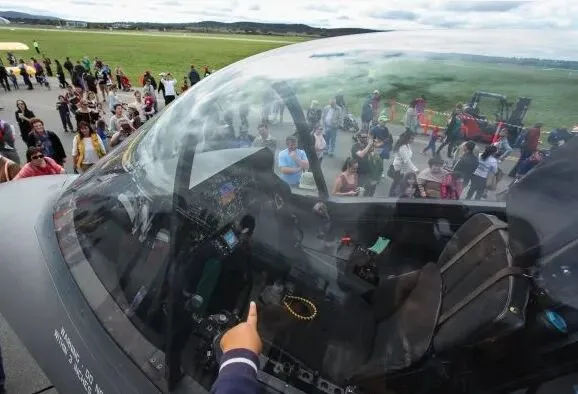 这张摄于2014年4月6日的照片显示,一名小观众在澳大利亚堪培拉机场开放日上参观F-35模型机驾驶舱。新华社发