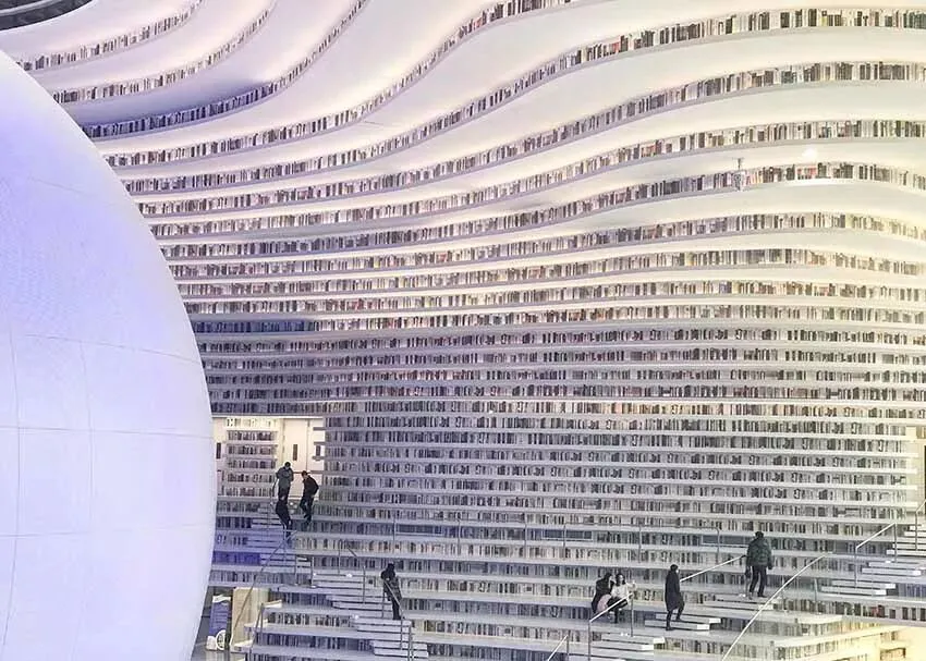 「普段、微博(@小乔是不是美女)をよく更新しているのですが、天津の図書館が話題になっていたので、足を運んでみました。始め、インターネットで写真を見たとき、「上にある本はどうやって取るのだろう」と不思議でしたが、その疑問も解決されました(笑)