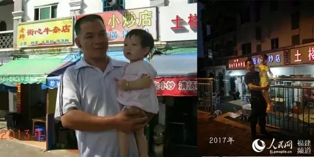 2013年爸爸和女儿在姑姑店门口拍了左边的照片,四年后,父女俩又以相同的动作拍了右边的一张,爸爸快要抱不动啦!