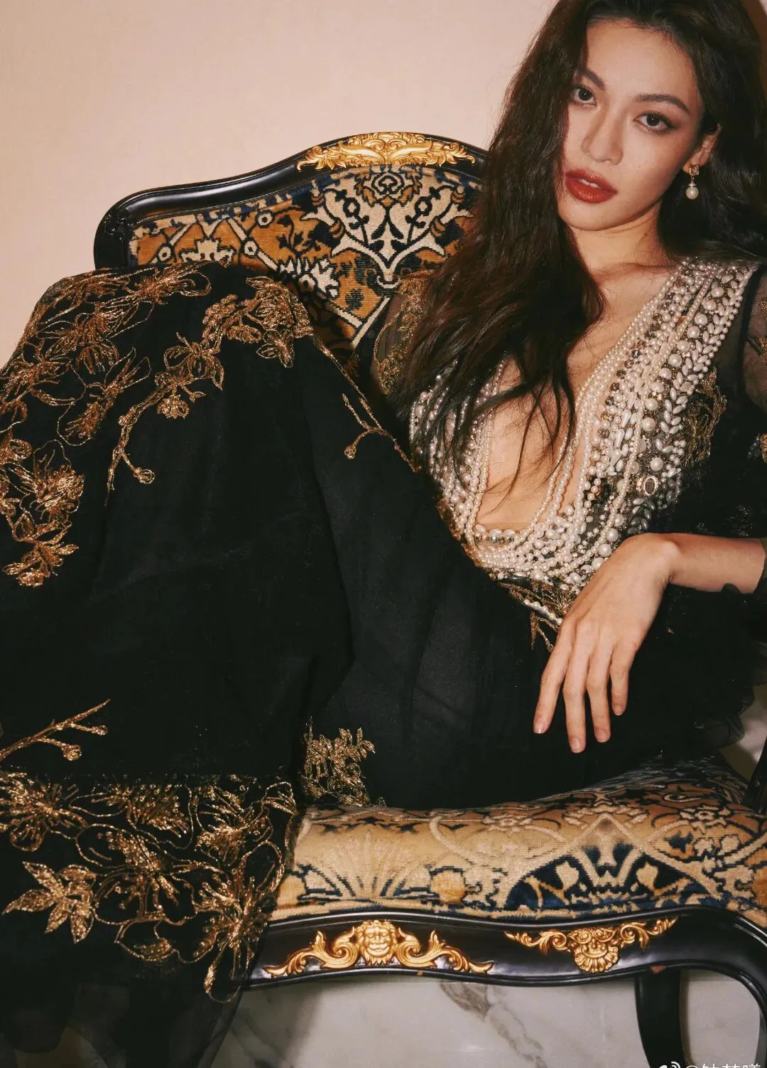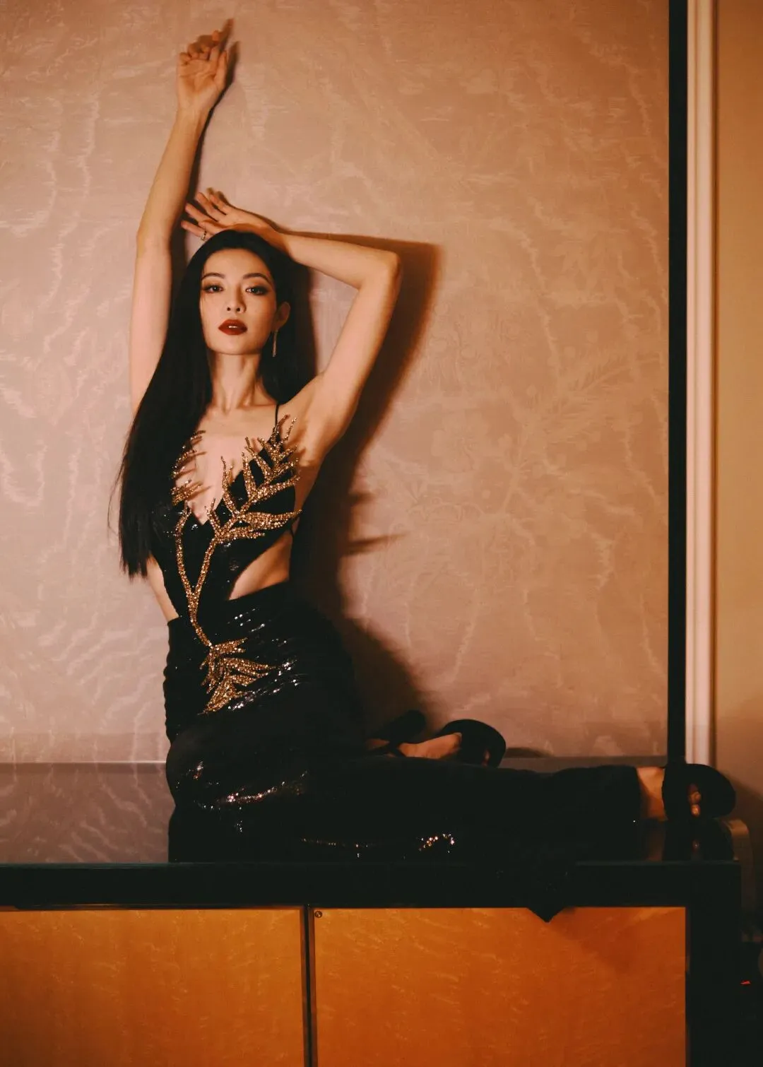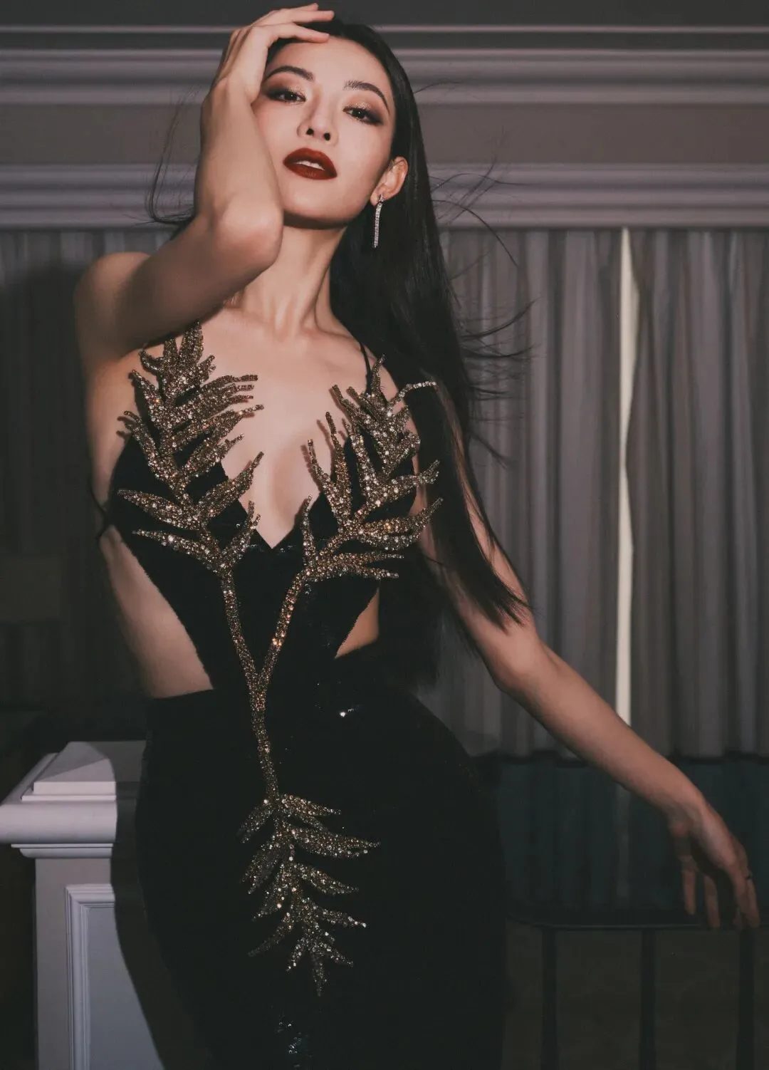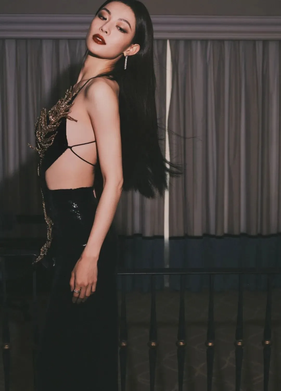钟姐第一套裙子来自意大利和斯里兰卡混血设计师Andrea Brocca 2024春夏系列,藤曼亮片贴合着她完美的身段线条,配上红唇黑长直,暗黑维纳斯降临,妥妥的红毯定海神针!😍