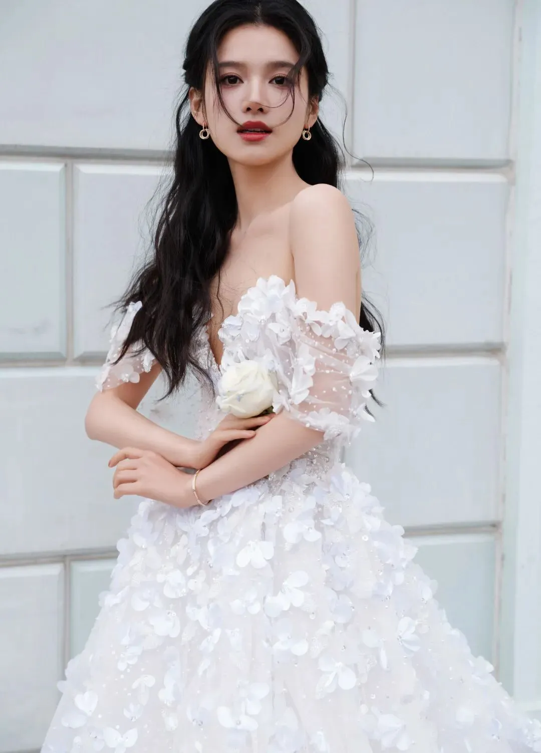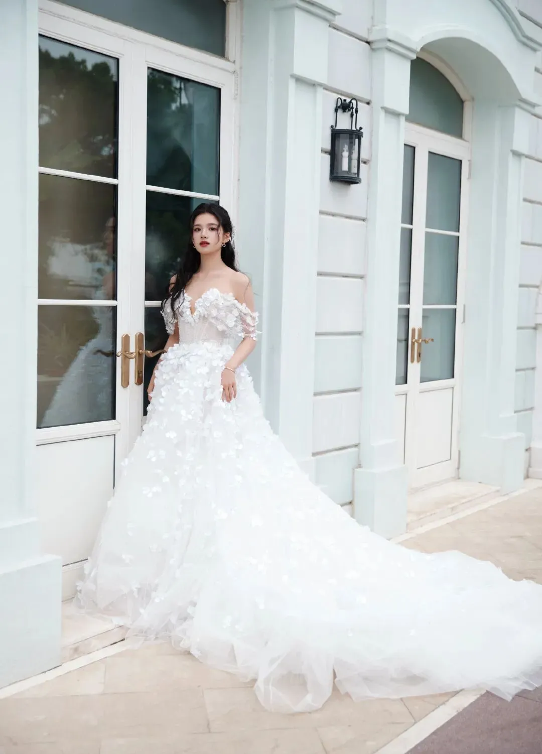 同样爱穿"蚊帐"的还有吴宣仪,这套裙摆夸张的大婚纱她穿上后依旧在土的边缘徘徊。😵
