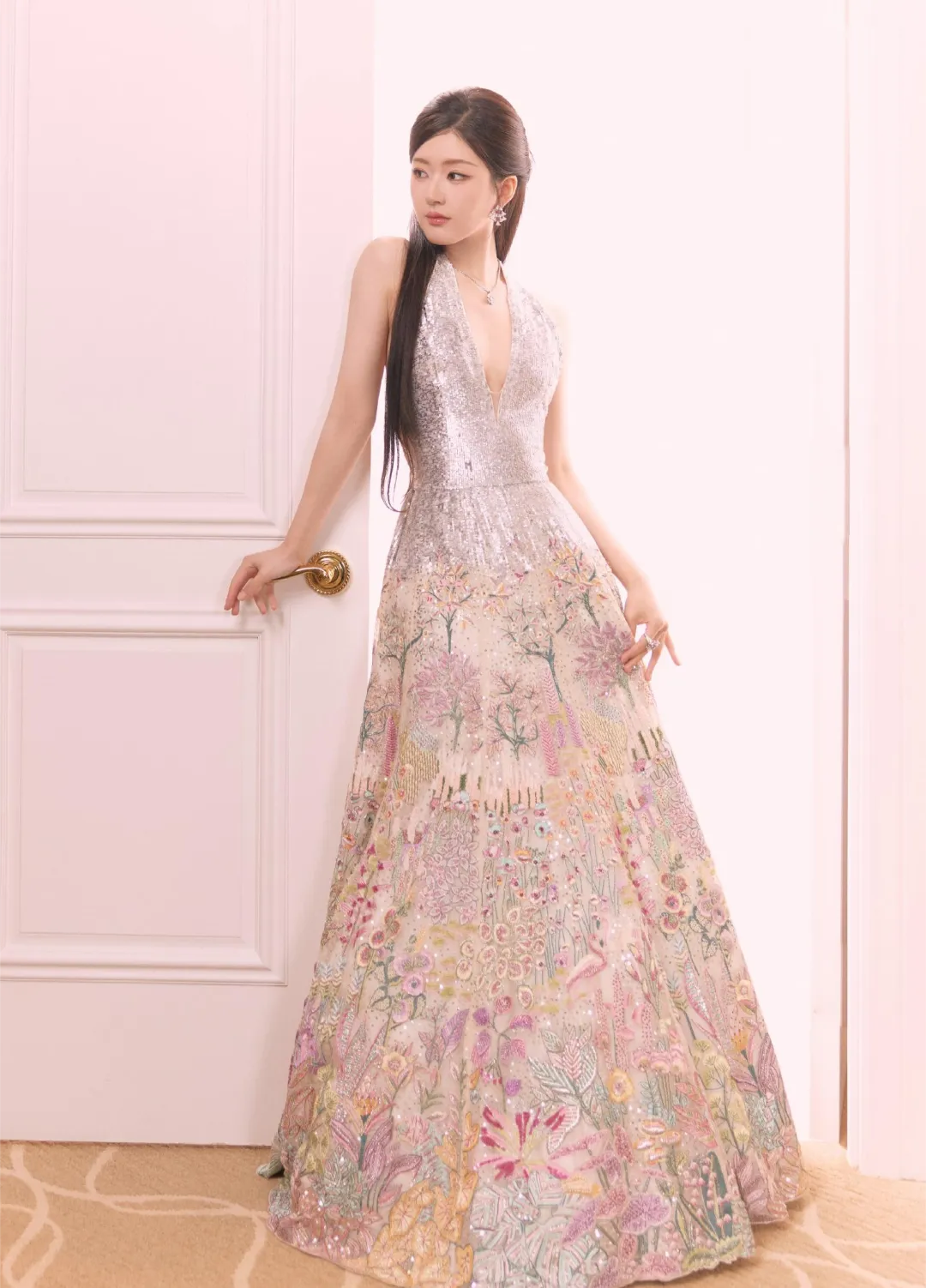 第二套内场look刺绣亮片裙来自Rahul Mishra 2023秋冬高定,很衬露思的身形和气质。