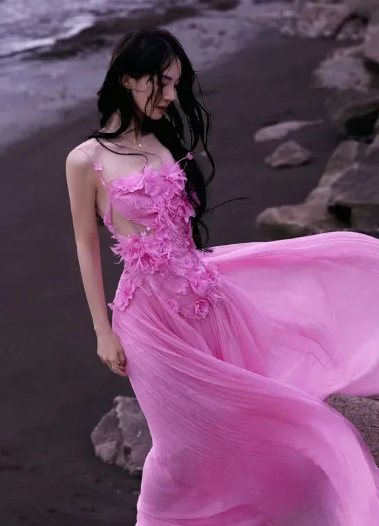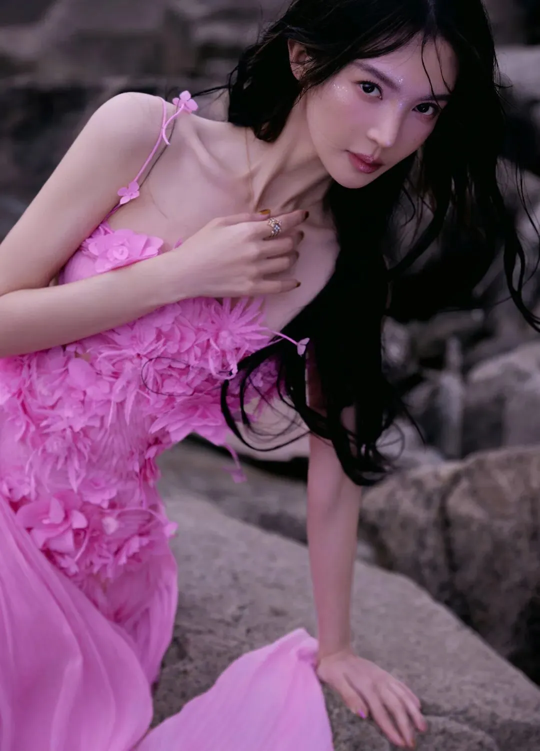 粉色娇嫩裙,从颜色、材质到版型都极其显廉价,是直接从酒店扯下一块破皱的薄纱窗帘再绣上几朵花就给人穿上了么?幸好是金晨穿,换个人更灾难。😨