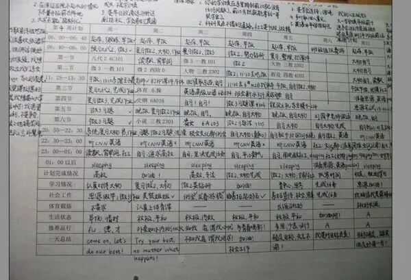每天6点起床,6:40开始自习,白天除了上课和吃饭,其余大部分时间都用来自习、听英语,直到凌晨1点才上床睡觉,连周末也是如此。
