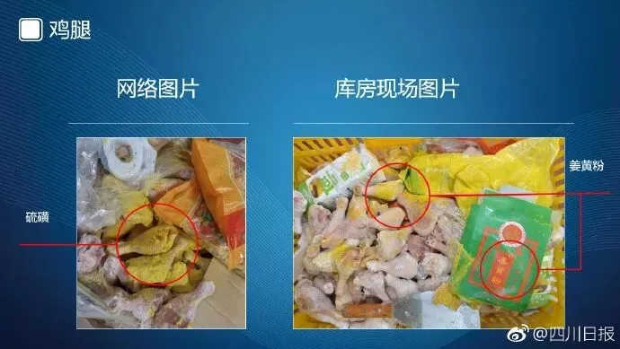 第三组是鸡腿照片。左边照片是网络流传的使用了硫磺的鸡腿;右边照片清楚显示,鸡腿表面的黄色粉末实际上是姜黄粉,根本不是硫磺。
