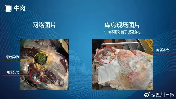 第五组是牛肉照片。左边是网络流传的所谓变质牛肉;右边是冻库拍摄的牛肉照片,大家可以清楚地看到冰冻牛肉的色泽正常,其表面有淡黄色的板栗和白色的被撕破的食品包装袋,不是变质牛肉。