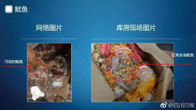 第四组是鱿鱼照片。左边是网络流传的污染了的鱿鱼照片;右边照片是冰冻鱿鱼的色泽正常,其上附着的黄色、绿色物为玉米、豌豆、火腿肠等其它食材。